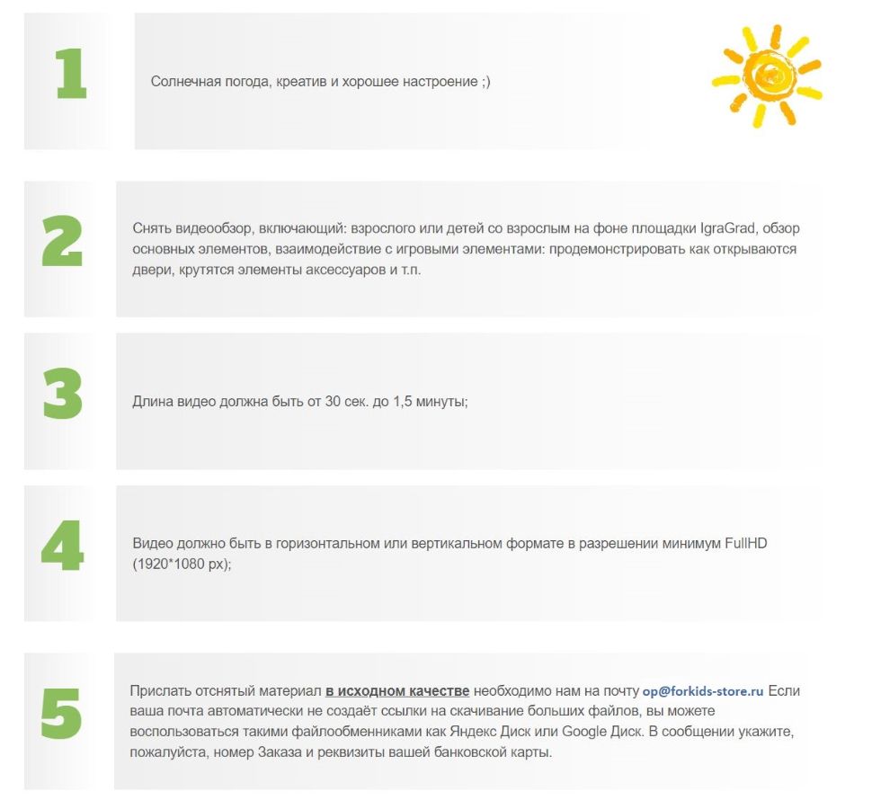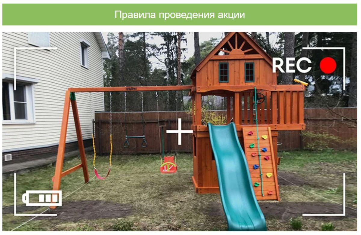 В целях повышения уровня обслуживания покупателей, наша компания проводит акцию — "Делитесь впечатлениями — получайте кешбэк!". Задача простая - снимите видеообзор вашей собранной детской площадки / зимней горки IgraGrad и получите от нас в знак благодарности 3%* от её стоимости (* - но не более 15 000 руб.)