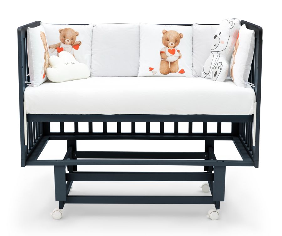Продольный маятник поможет уснуть вашему крохе, кроватку можно качать вправо-влево. Мягкий и бесшумный маятник блокируется, когда это необходимо. Ортопедические свойства ложа обеспечивает латофлекс (гнутые рейки).