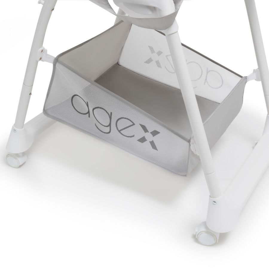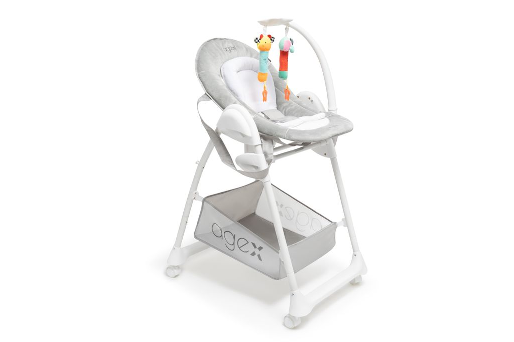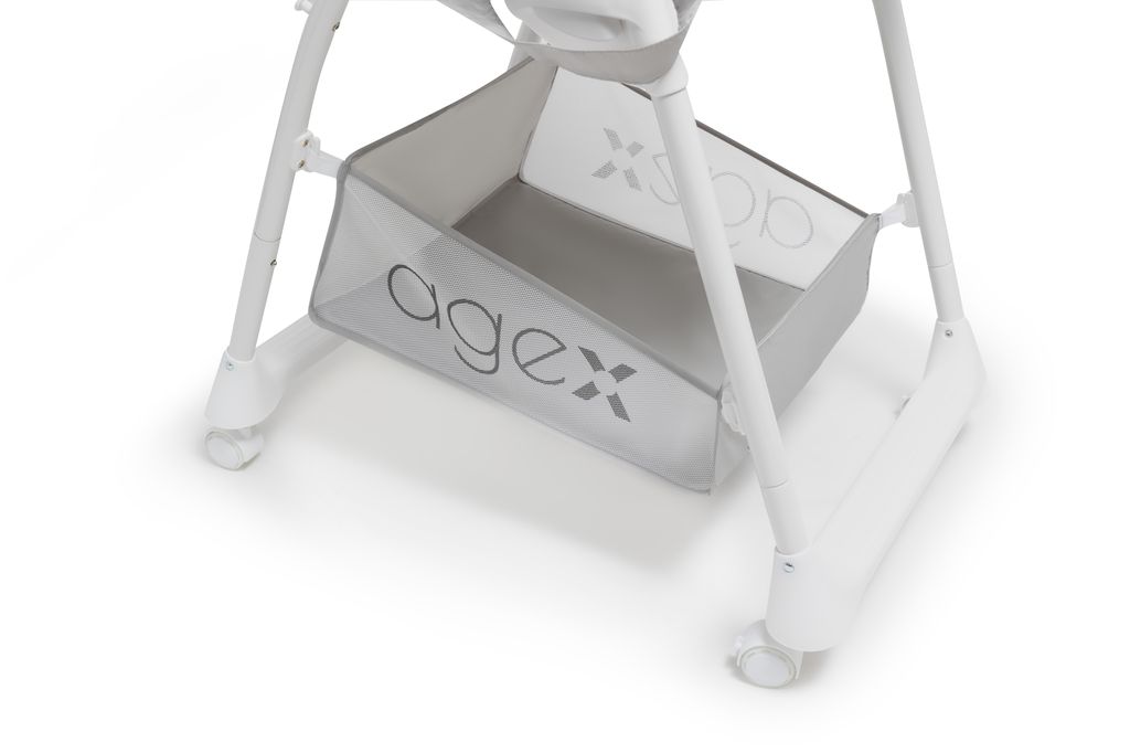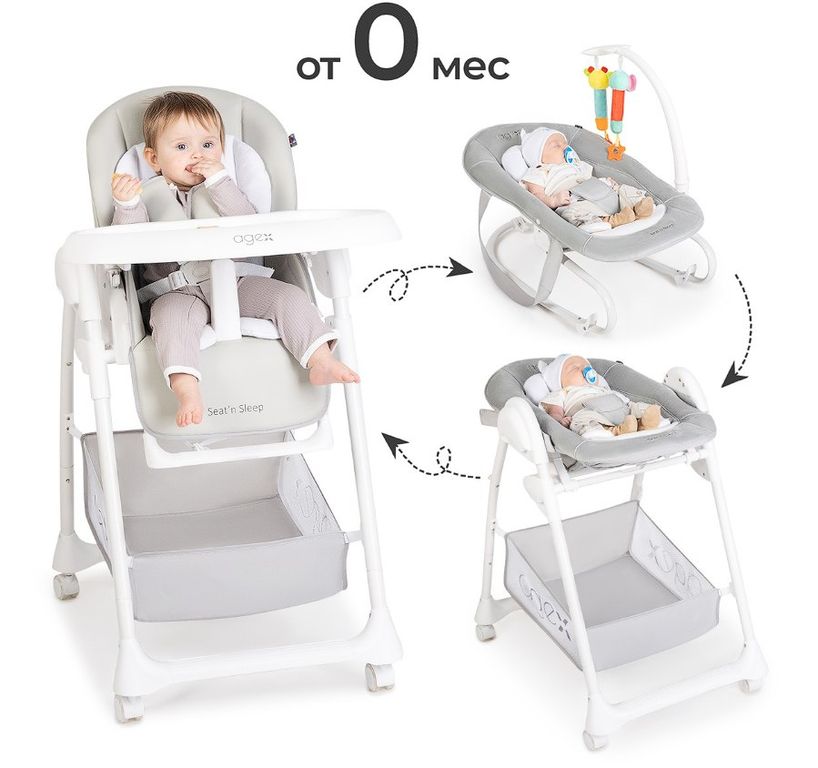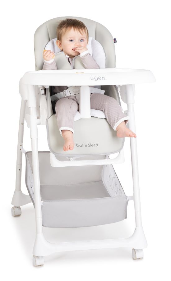 Agex Seat’n Sleep не только стул для кормления, но и удобный шезлонг. Снизу большая корзина для хранения любимых игрушек и разных мелочей. Пока малыш еще совсем маленький используйте шезлонг с регулируемой по наклону спинкой, обеспечивая комфортное положение для сна или игры. Когда малыш научится сидеть самостоятельно, можно пересаживать его в стульчик. Высота стульчика легко регулируется, что позволяет малышу сидеть с Вами за обеденным столом. Для безопасности используются 5-точечные ремни. Благодаря колесам, стульчик Эйджекс Сит н Слип очень мобильный и его легко передвигать по дому.