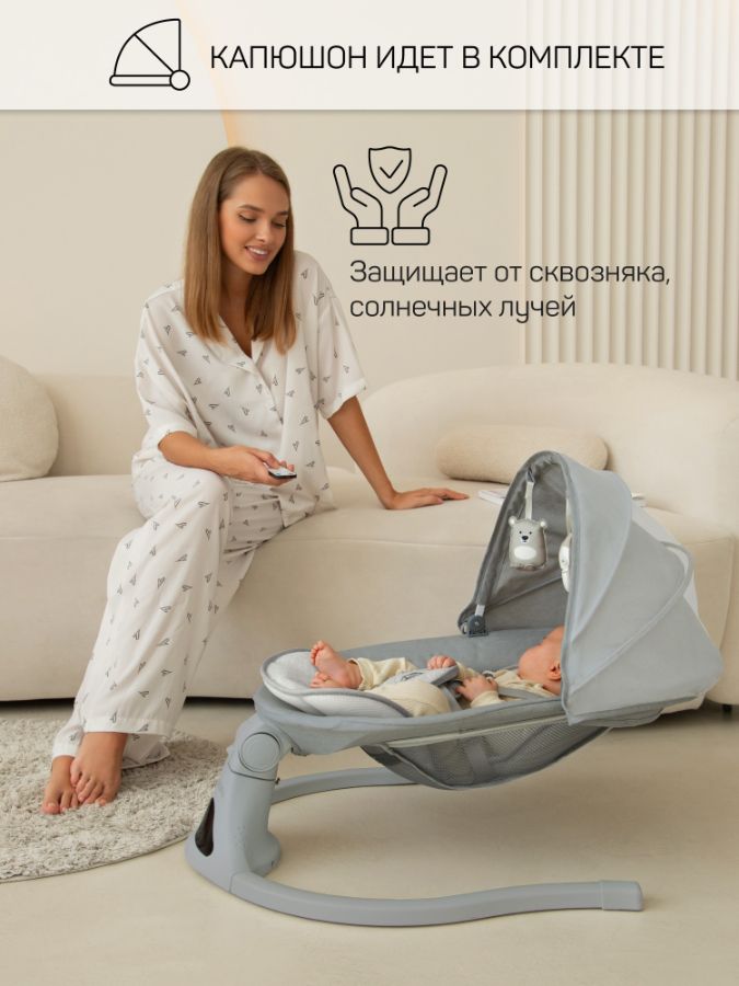С помощью пульта ДУ, который идет в комплекте, вы легко сможете управлять функциями электрокачели на расстоянии, продолжая заниматься домашними делами. 5 скоростей укачивания позволяет настроить интенсивность качания в соответствии с вашими предпочтениями.