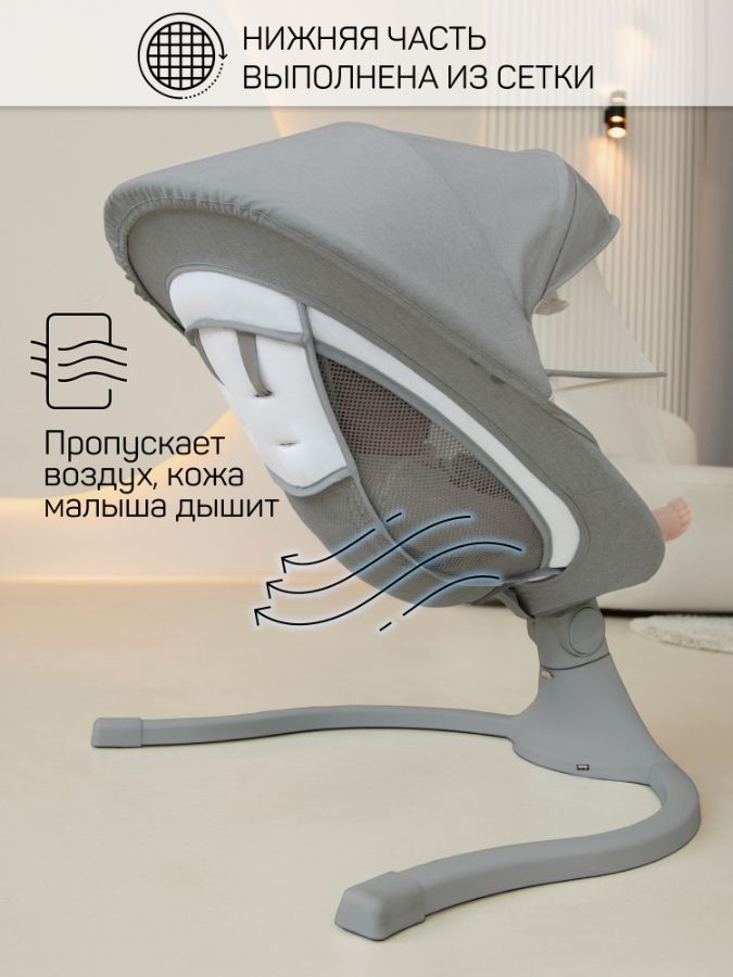 Возможность использовать качели без матрасика в жаркую погоду позволит ребенку ощутить дополнительный комфорт во время сна, сетчатая спинка предотвратит перегревание.