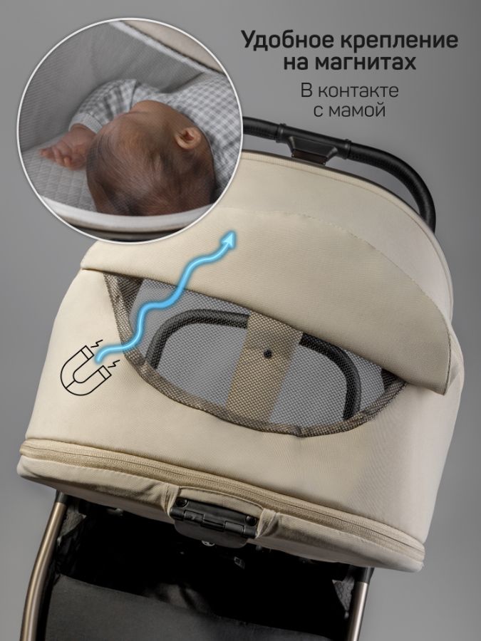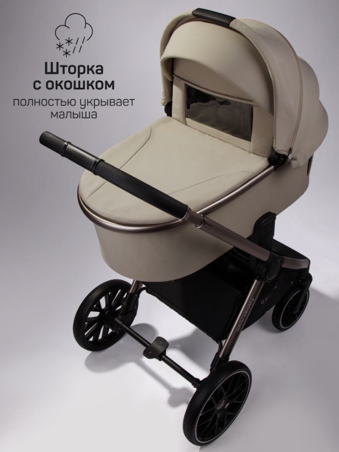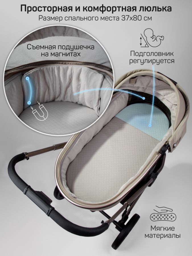 Для защиты люльки от осадков и ветра предусмотрен глубокий капор. Теплый чехол на ножки с ветрозащитным отворотом накидки под верх капора имеет со смотровое окошко и фиксируются на магниты. В комплекте есть солнцезащитный тент от солнца - очень стильный и функциональный. Спальный блок оснащен кнопками с системой памяти, позволяющие снимать одной рукой, а сверху расположена ручка с удобным хватом и практичной отделкой из экокожи.