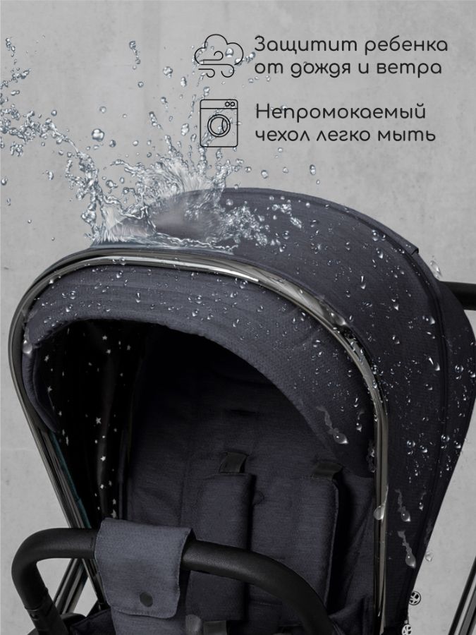 Для защиты от осадков и ветра предусмотрен глубокий капор с ветрозащитой, теплый чехол на ножки и дождевик, а также есть дополнительное окно, которое можно закрыть при необходимости. Для теплого времени года в комплекте идет москитная сетка.
