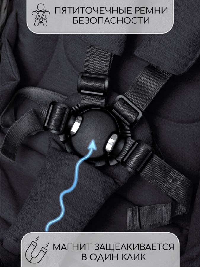 Пятиточечные ремни защелкиваются на магнитное крепление, что повышает уровень безопасности ребенка и позволяет быстро и комфортно пристегнуть малыша.