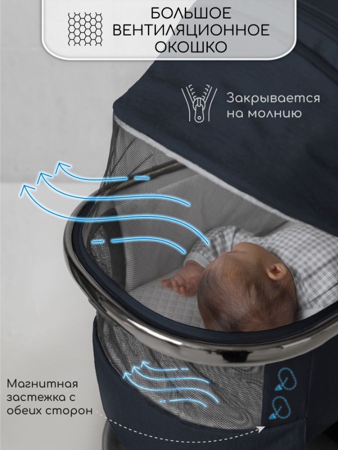 Для жаркого лета предусмотрены большие вентиляционные окошки, которые есть и на люльке, и на прогулочном блоке. В зимнее время года все окна надежно закрываются на молнию, а у изголовья люльки теперь есть воротник для дополнительной защиты от продувания.