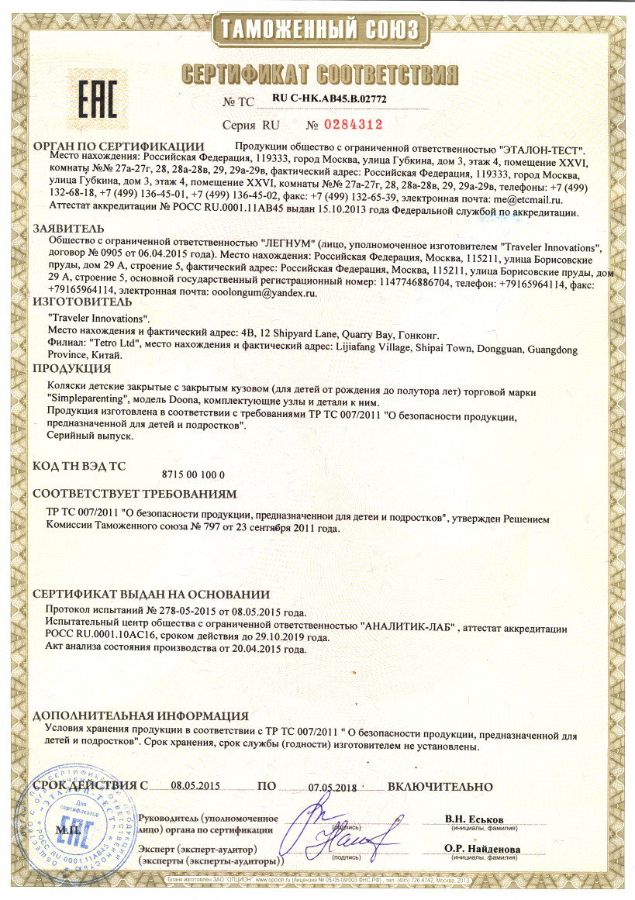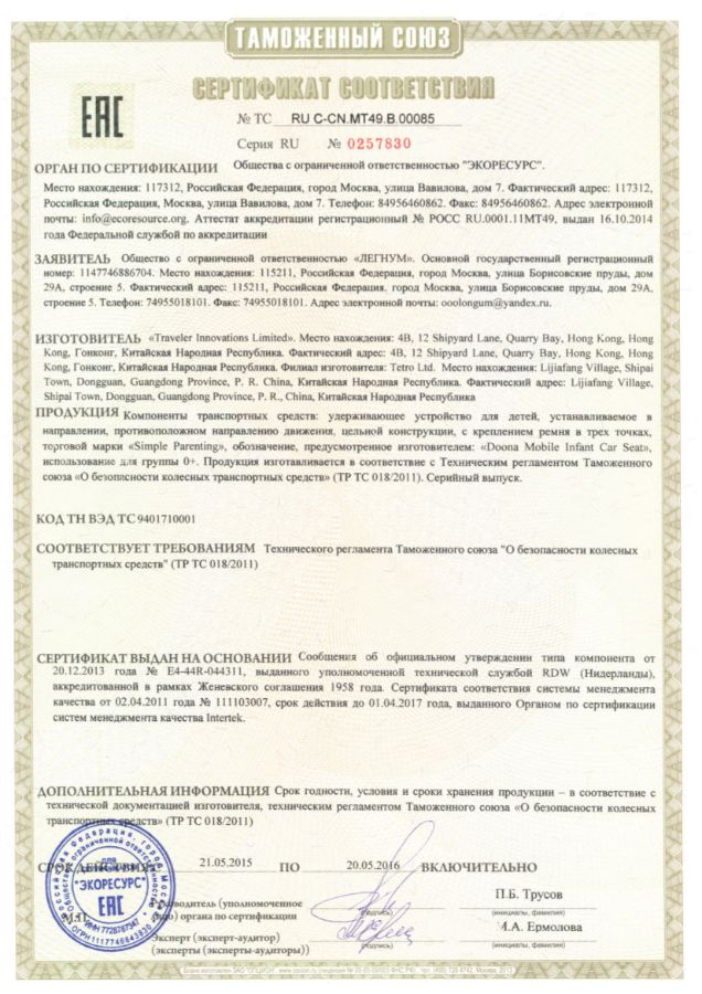 Покупая SimpleParenting Doona Plus - автокресло-коляска в нашем магазине, вы приобретаете сертифицированную продукцию с официальной гарантией 24 месяца.