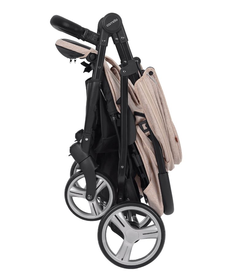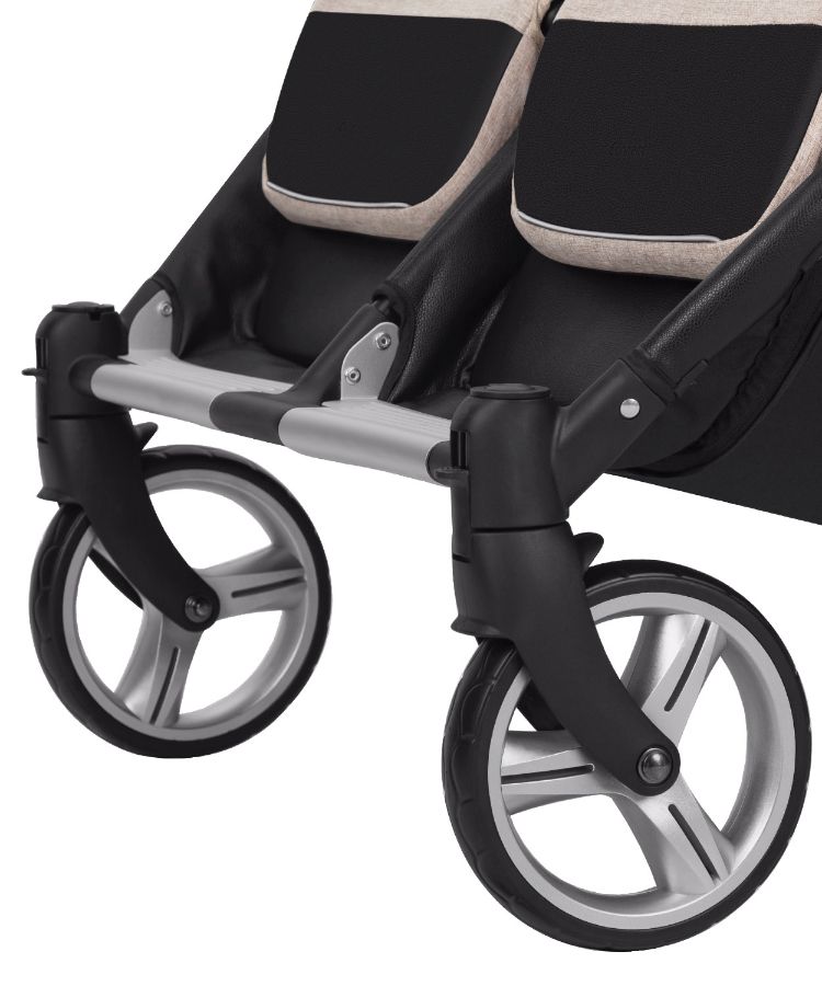 Влагоотталкивающие подножки и опора для ножек с алюминиевой вставкой дополняют дизайн и облегчают уход, продлевают срок службы коляски. Амортизация задней оси, сгладит неровности дорожного покрытия. Все колёса легко снимаются для ухода, компактного хранения и транспортировки коляски.Рама компактно складывается вместе с сиденьями, что в значительной степени улучшает мобильность родителей.