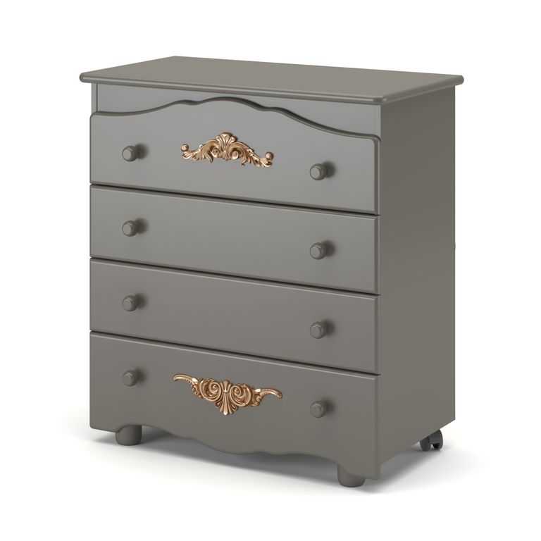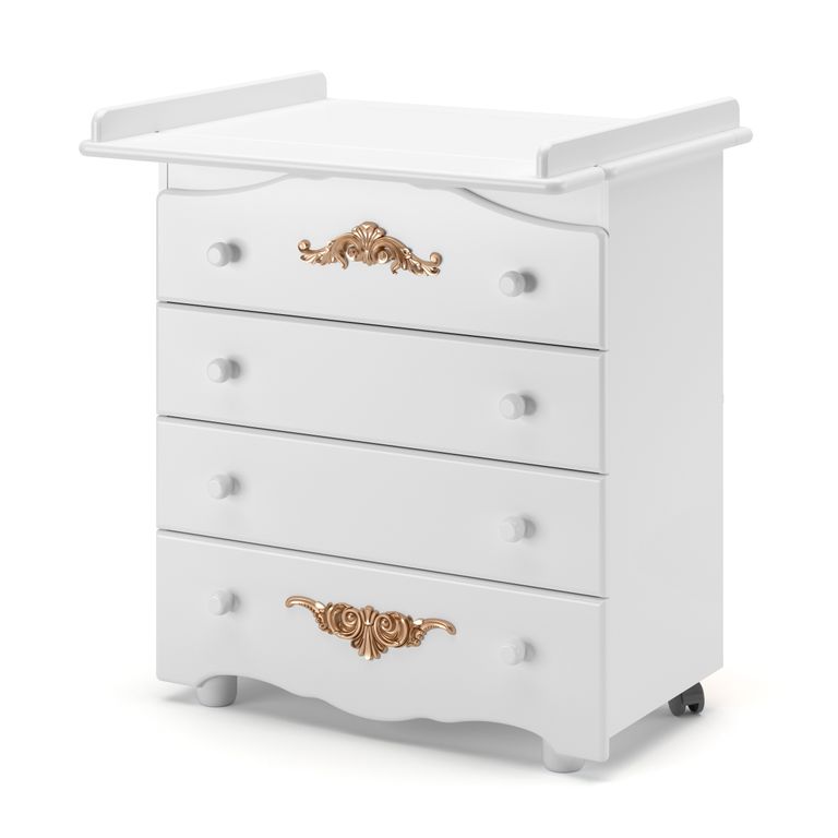 Этот элегантный комод, имеющий практичные размеры (высота 90см, ширина 84 см, глубина 44 см), с легкостью вместит все «приданое» малыша, а впоследствии будет удобен для хранения вещей подросшего ребенка. Пеленальная доска, которая устанавливается на крышке комода, имеет размер 75х68 см, что дает возможность с удобством переодеть младенца и провести гигиенические процедуры. Устойчивые прочные ножки, расположенные спереди, подчеркивают основательность фасада. Колесики, установленные сзади, позволяют при желании без труда передвигать изделие.