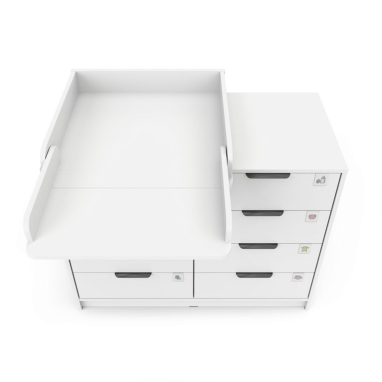 Пеленальный столик снимается и устанавливается одним простым движением, не оставляя никаких следов на столешнице, при этом надежно фиксируется через специальные металлические втулки в задний торец столешницы. Его можно установить в 3 положения - слева, справа и по центру комода. Тем самым, вы сами определяете, с какой стороны останется место для средств по уходу за малышом.