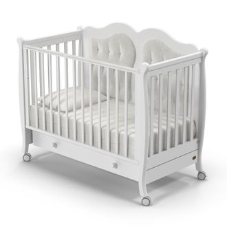 Первоначально кроватка Нуовита Афетто может использоваться для малыша в качестве спального места. Затем, по мере роста ребенка, родители могут превратить ее в уютный диванчик — для этого достаточно убрать съемную боковую стенку. Особую привлекательность диванчику придаст мягкая спинка с изогнутой линией верха и эффектной отделкой. Размер спального места составляет 120x60см, что позволяет пользоваться стандартным матрасиком. Предусмотрен 1 уровень высоты ложа, боковая стенка может опускаться, облегчая доступ к ребенку. На перекладине находится силиконовая накладка. Изолированный бельевой ящик, легко скользящий на роликовых направляющих, сконструирован таким образом, что почти не привлекает внимания.
