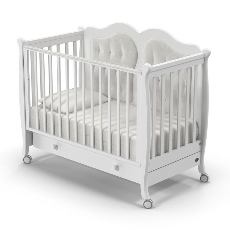 Легкое перемещение кроватки обеспечивается наличием 4-х прорезиненных колесиков. За фиксацию на месте отвечают стопоры, присутствующие на каждом из колес. Кроватка изготовлена из массива бука, отделочные элементы выполнены из МДФ, в конструкции ящика для белья используется ЛДСП. Качество всех материалов, покрытия и фурнитуры соответствует европейским стандартам.