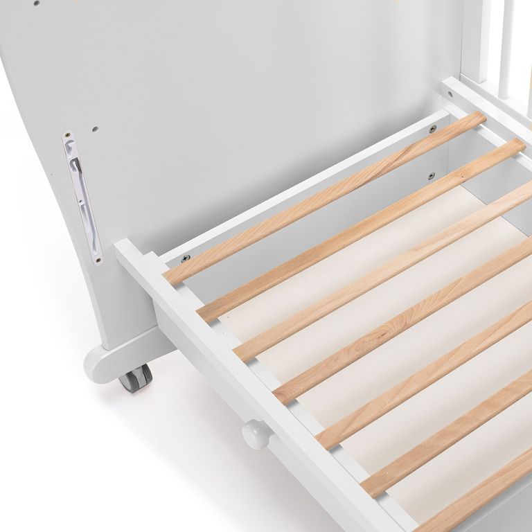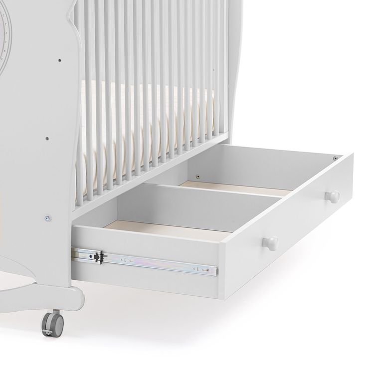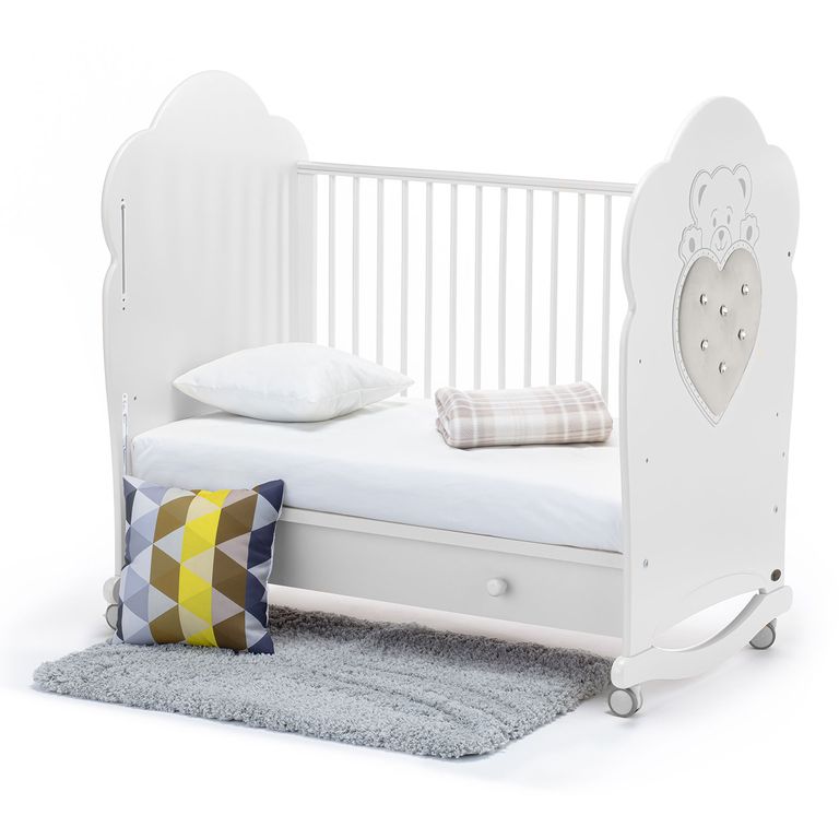 Присутствует прочный механизм регулировки боковой стенки по высоте. Также в конструкции заложена возможность полного извлечения боковой стенки, что позволяет пользоваться кроваткой длительное время. Для поручней предусмотрены 2 силиконовые накладки. Ящик для хранения белья является весьма вместительным, но при этом не выглядит громоздко.