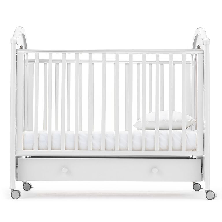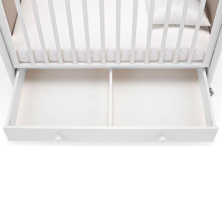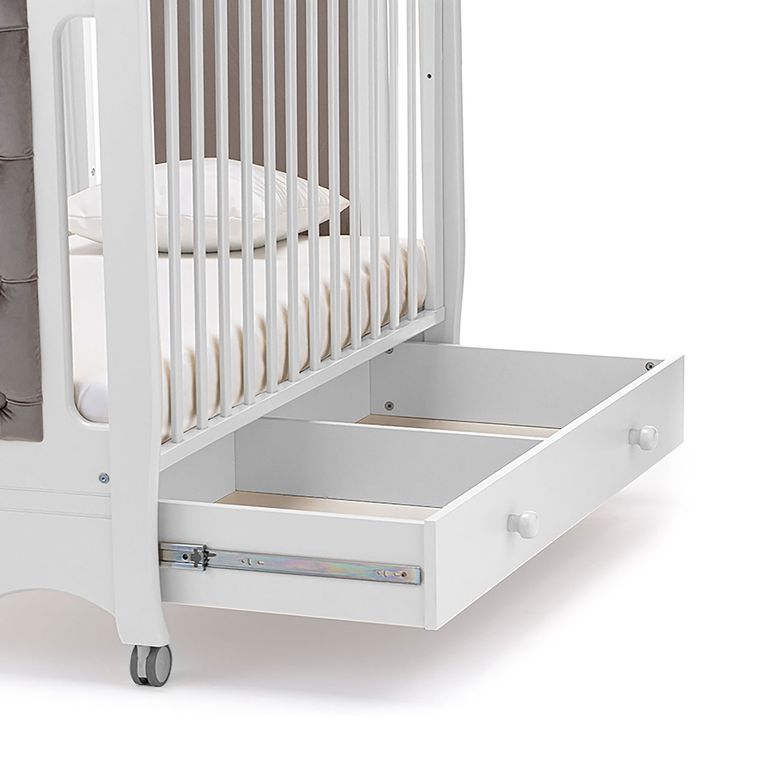 Кроватка очень удобна: размер спального места составляет 120x60см и подходит для большинства матрасиков, на поручнях находятся противоскользящие накладки, для перемещения предусмотрены колесики со стопорами. Расположенный внизу бельевой ящик является прочным и вместительным.