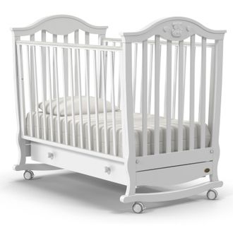 Спальное место имеет стандартный размер 120x60см. Регулировка высоты ложа не предусмотрена — это связано с особенностями дизайна модели, имеющей необычную эффектную форму, несколько расширяющуюся в верхней части. Опускаемая боковая стенка удобна для ухода за малышом, на поручнях имеются силиконовые накладки. При необходимости стенка легко демонтируется, превращая кроватку-качалку в традиционную кровать. При желании можно использовать изделие и в качестве диванчика. Внизу находится удобный ящик для белья.