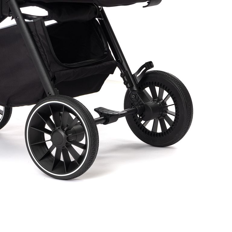 Резиновые колеса с широкими покрышками и глубоким протектором с лёгкостью преодолеют любые преграды. Они мягкие и имеют очень приятное сцепление с дорогой. Продуманная амортизация в шасси делает поездку даже по плохим участкам пути комфортной. При движении по песку или снегу переднюю пару колес можно заблокировать в положении прямо. Так коляска Baloni превратится в небольшой вездеход и преодолеет даже бездорожье! Ручка покрыта мягкой перфорированной эко-кожей и разделена кнопкой сложения. Она не регулируется по высоте, но находится на оптимальном уровне и удобна как для высоких, так и для миниатюрных родителей.