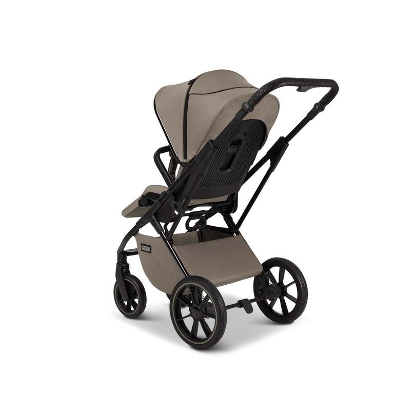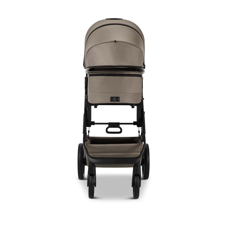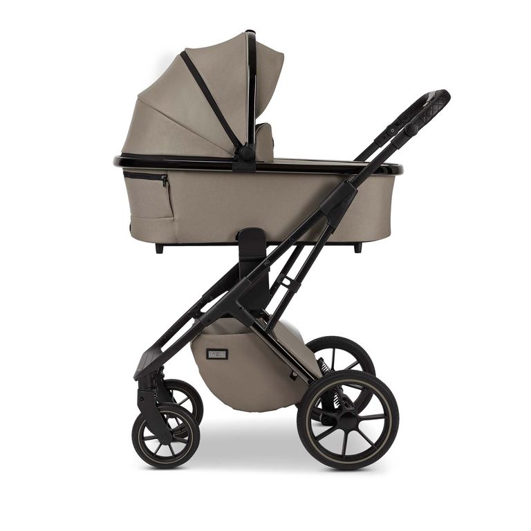 Люлька коляски Moon Piu легко отсоединяется от шасси с помощью системы Memory Button. Инновационная разработка позволяет родителям без особых усилий снимать люльку с шасси, нажимая на кнопки по очереди, а не одновременно. Сверху капюшона люльки имеется ручка с отделкой из веганской эко-кожи, которая позволяет легко переносить люльку.