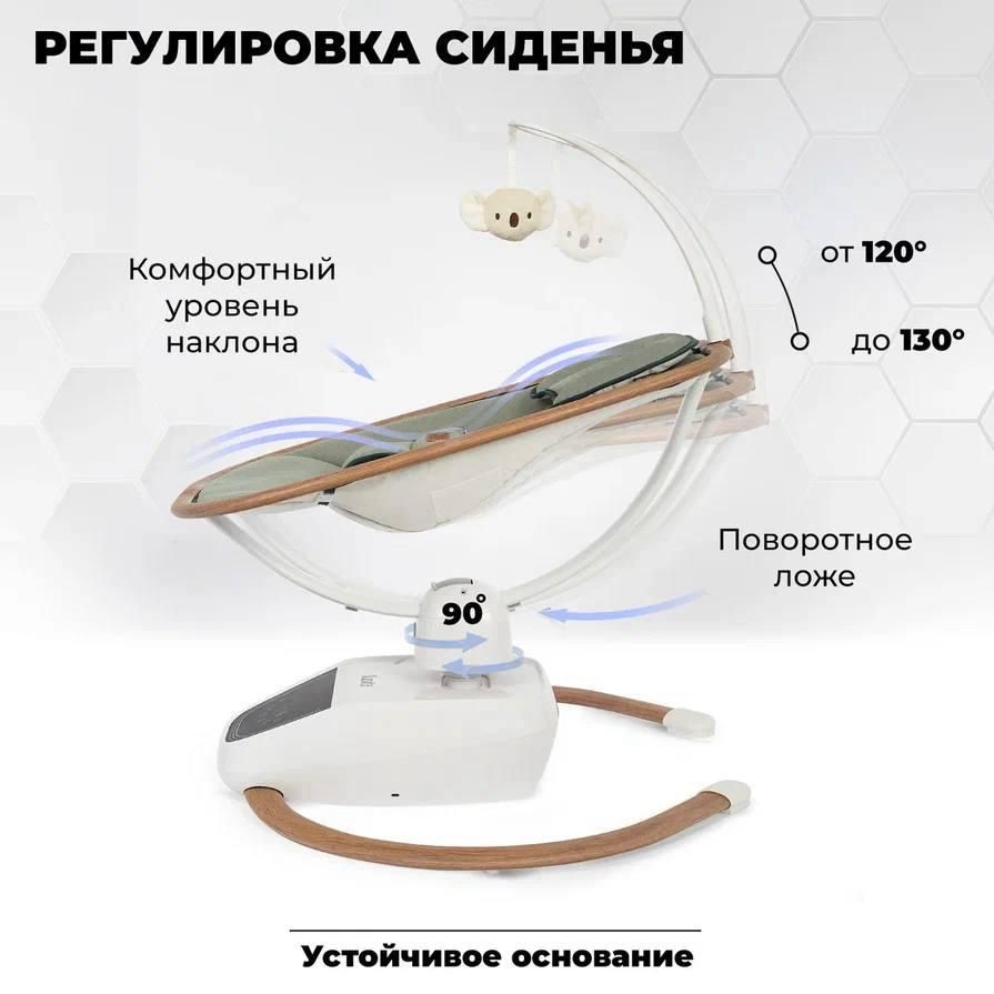 Главное преимущество данной детской электрокачели — несколько режимов качания. Разнообразие вариантов складывается из нескольких комбинаций видов движения и скоростей. При этом характер раскачивания имитирует движения маминых рук: это не просто вибрация или маятниковое качание по принципу «назад-вперед», а полноценные амплитудные траектории, одобренные практикующими врачами – неонатологами и кинезитерапевтами.
