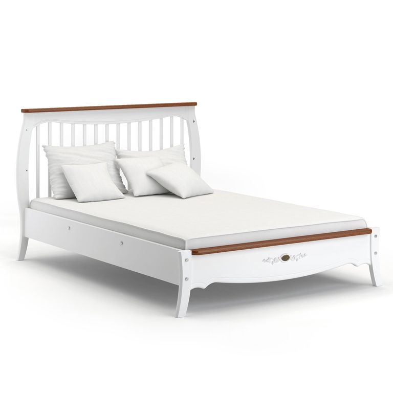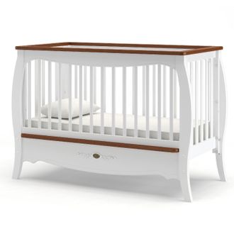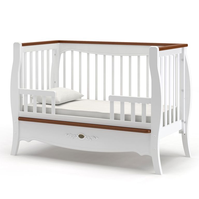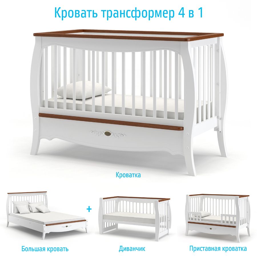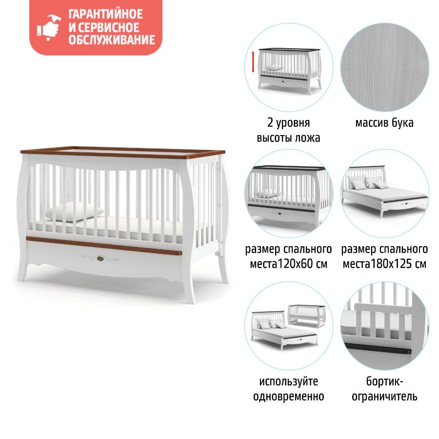Еще одна очень важная особенность заключается в том, что вы можете одновременно собрать большую кровать (со спальным местом 180х125см) и уютный диванчик. Тем самым получая возможность одновременно использовать сразу две трансформации. Кроватка выполнена в стиле, напоминающем о традициях итальянского барокко: с изогнутыми стойками, элегантными перекладинами и замысловатыми виньетками на нижней части фасада. Материалом служит массив бука. Эмаль, применяемая для защиты от влажности, специально разработана для производства детской мебели. Для покрытия используется безопасный лак, изготовленный на полиуретановой основе.