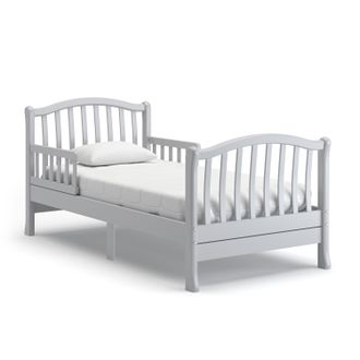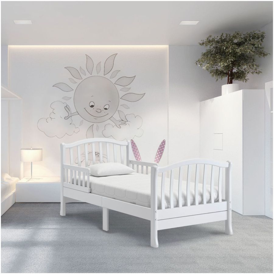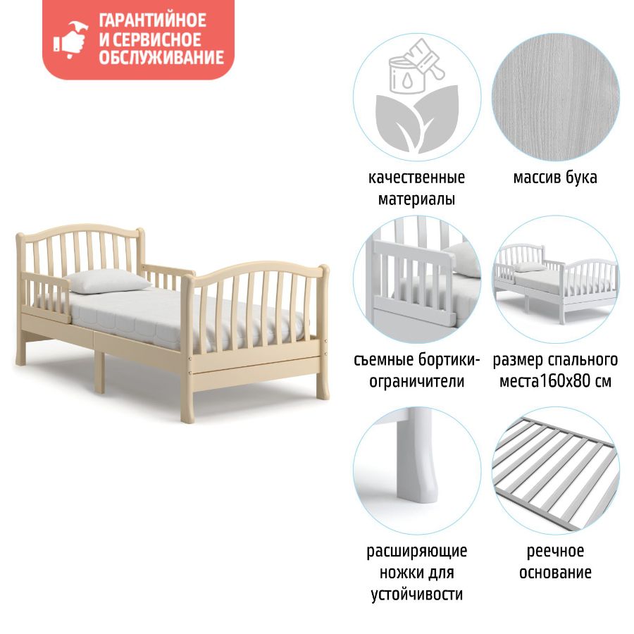 Эта модель подойдёт как для маленьких деток, начиная с трёхлетнего возраста, так и для детей-подростков. Создателями заботливо предусмотрены удобные съёмные бортики, установленные в головной части кровати. Благодаря этому родители могут не опасаться, что неспокойный ребёнок упадёт с постели. Изящная спинка выполнена из тонких изогнутых реек, создающих впечатление лёгкости и воздушности. Подобное оформление имеет и функциональное предназначение, благодаря этому родителям даже на расстоянии хорошо виден спящий ребёнок. Мягкий изгиб спинки является интересным дизайнерским решением, воплощающим классические традиции итальянского производства мебели. В юном возрасте спится лучше на мягкой и одновременно плоской поверхности. Кровать имеет просторное ложе размером 160*80 см, которое позволит ребёнку удобно раскинуться на постели, обеспечит спокойный и безмятежный сон. Основание, выполненное полностью из массива бука, является надёжным и прочным благодаря применению оригинальной итальянской крепёжной фурнитуры. Ножки кровати расширяются у пола, что добавляет всей конструкции элегантности и предупреждает опрокидывание кровати.