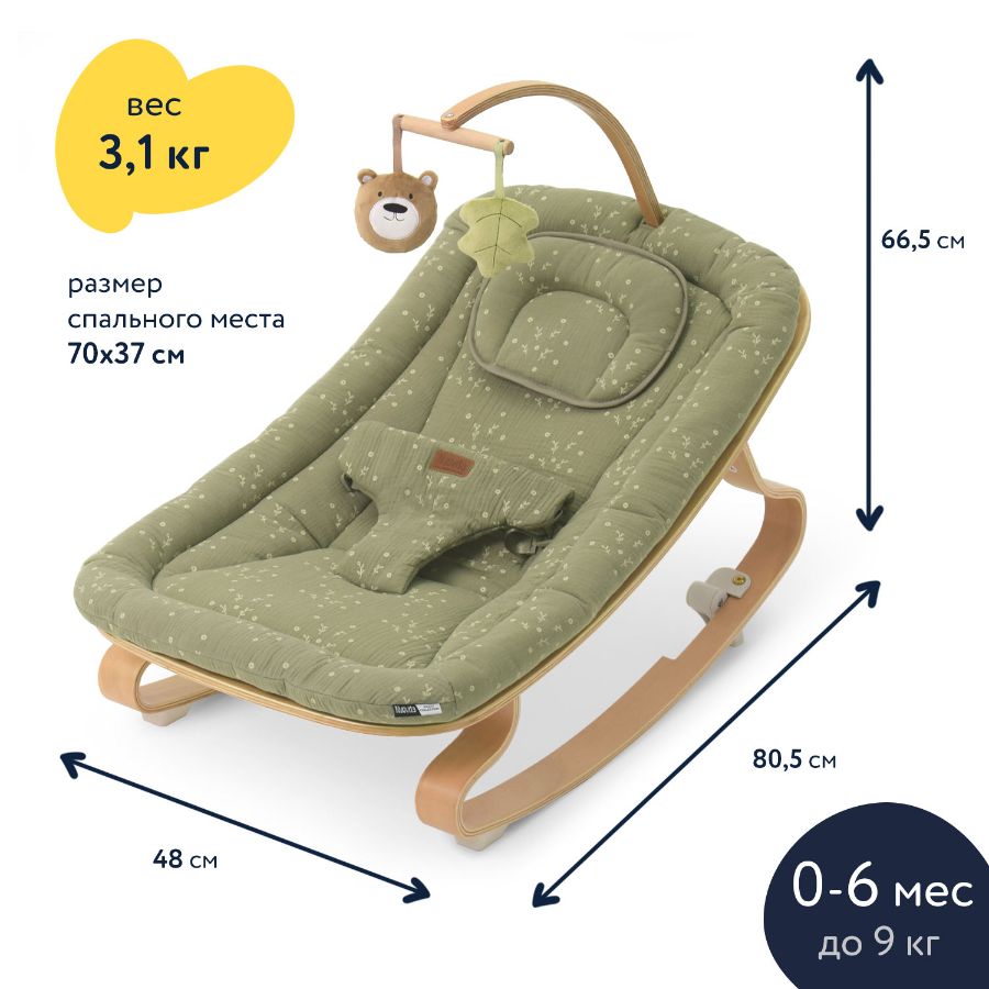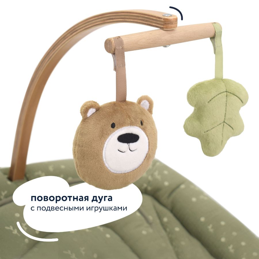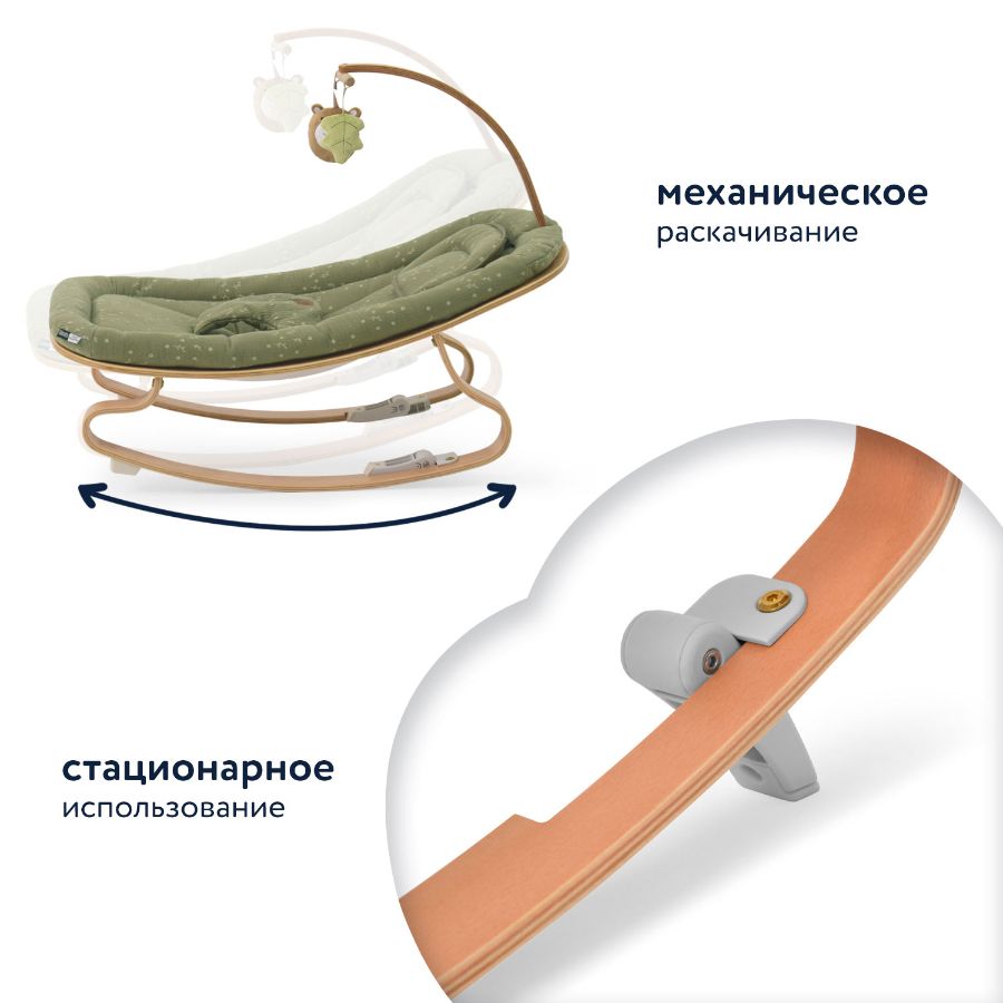 Одновременно в кресле-шезлонге для новорожденных INIZIO I2 есть все необходимое, чтобы обеспечить ребенку полноценное развитие: в комплектацию входит поворотная дуга с подвесными игрушками, за которыми малыш может наблюдать, тренируя зрение, и к которым он станет тянуться, тренируя мышцы ручек, координацию и хватательный рефлекс. При этом деревянные поверхности и хлопковая материя, до которых ребенок будет дотрагиваться, обеспечат условия для развития его тактильных ощущений и мелкой моторики.