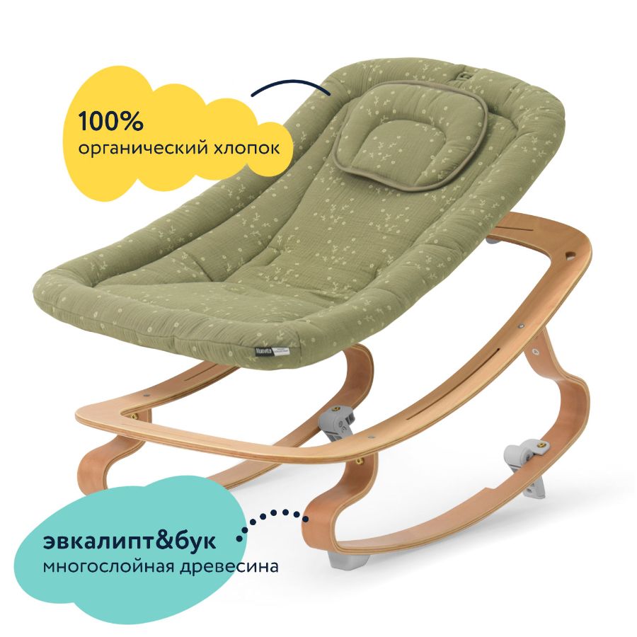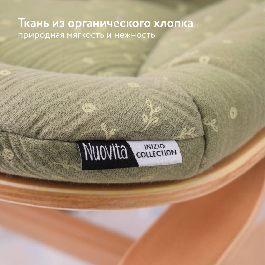 Шезлонг INIZIO I2 буквально вдохновлен природой! Основание качели-шезлонга для новорожденных выполнено из многослойной натуральной древесины: эвкалипта и бука. Обе породы обладают высокой прочностью, отлично гнутся и надежно удерживают крепления конструкции. Для склеивания древесины используются безопасные клеи категории E1. Мягкий вкладыш шезлонга для младенца INIZIO I2 сшит из стопроцентного органического хлопка. Матовый лак, которым покрыты деревянные детали, изготовлен на водной основе, то есть также является полностью безопасным и экологически чистым.