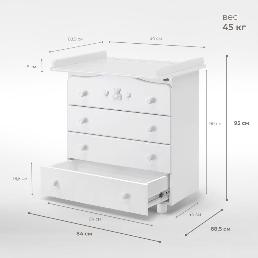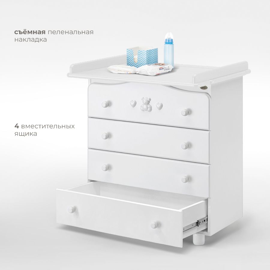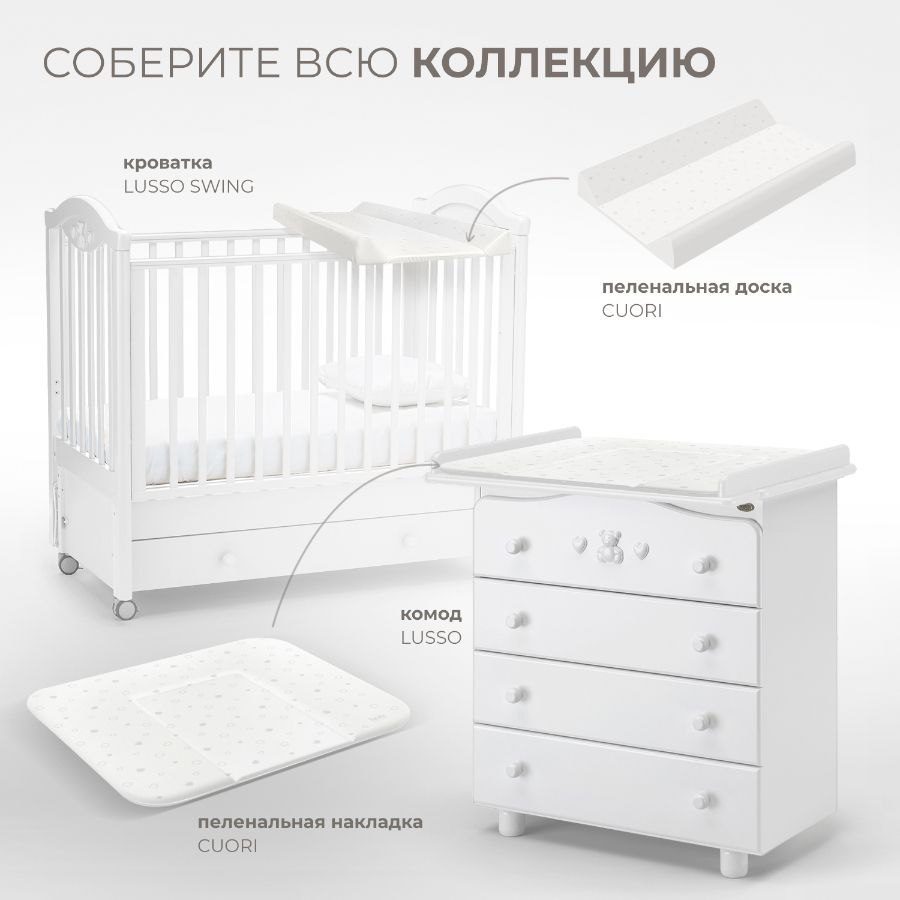 Итальянские детские пеленальные комоды для новорожденных Nuovita Lusso очень удобны, так как оснащены четырьмя вместительными ящиками для хранения детской одежды или других вещей. Изделия комплектуются съемной доской для пеленания, которая устанавливается поверх корпуса и имеет ограничительные бортики для безопасности крохи.