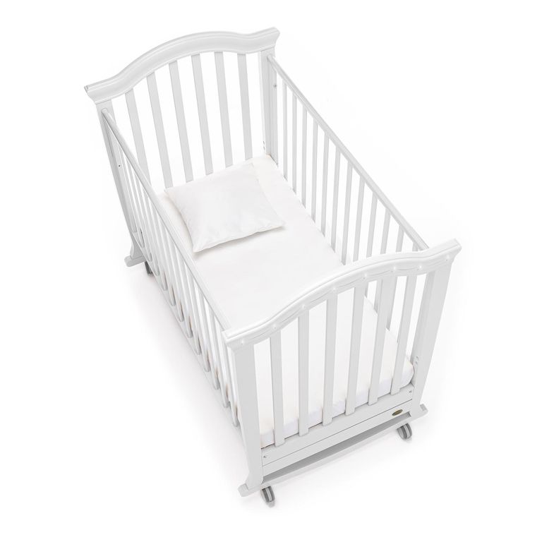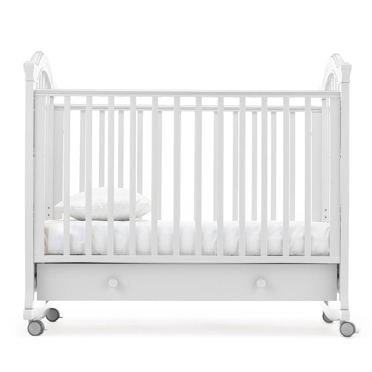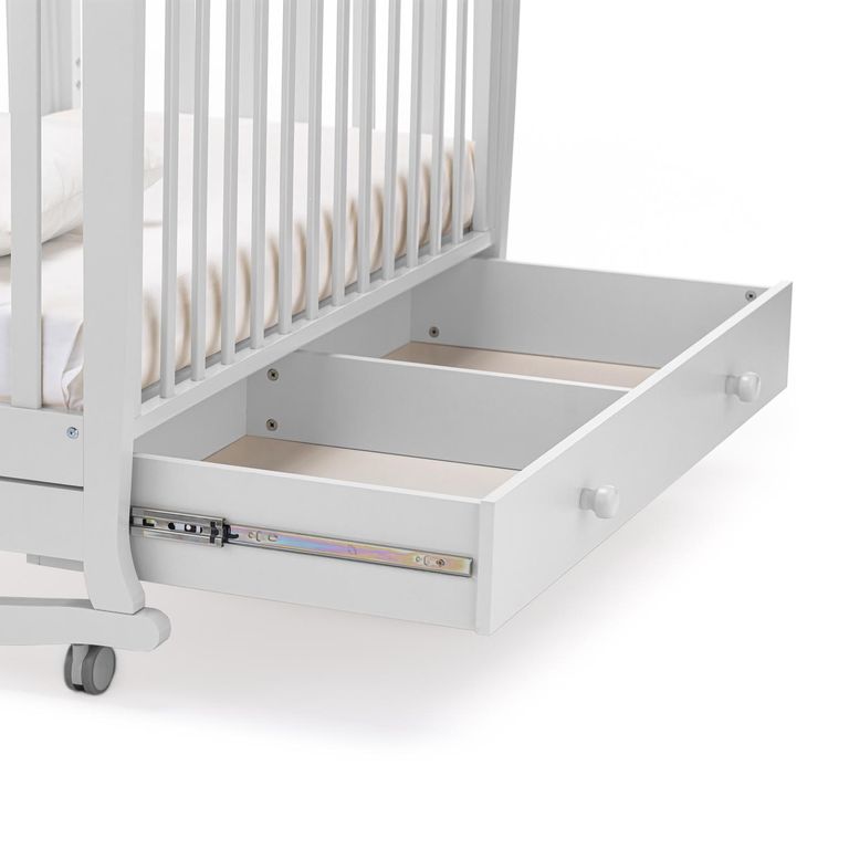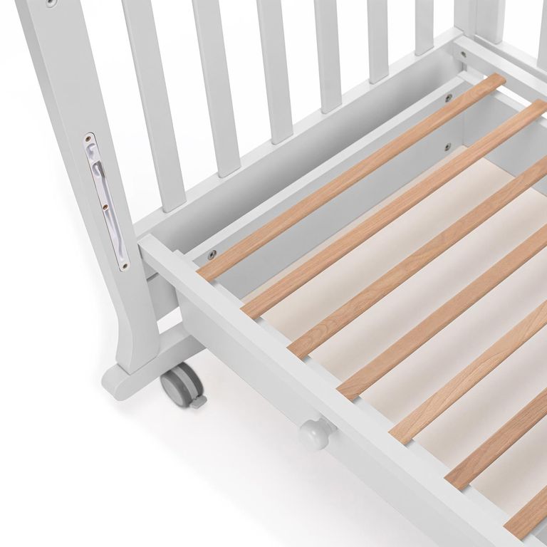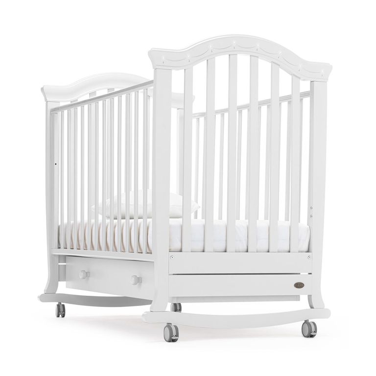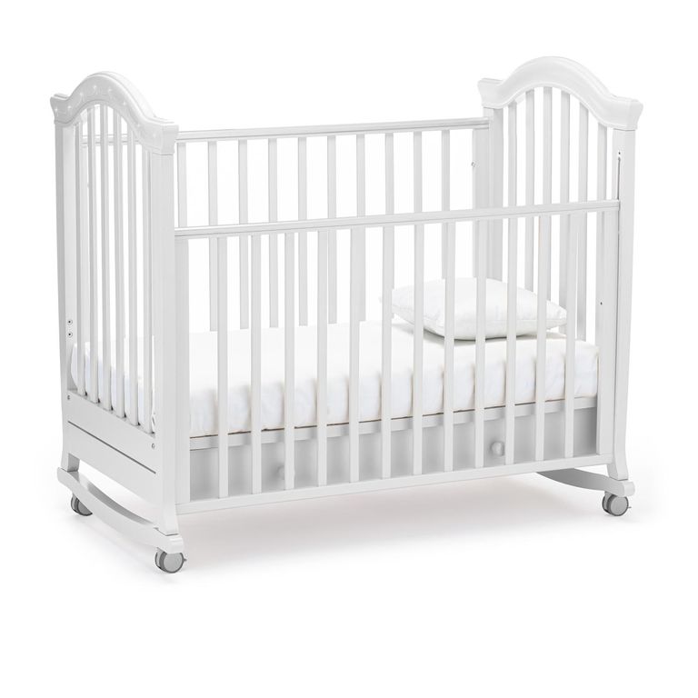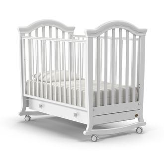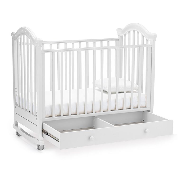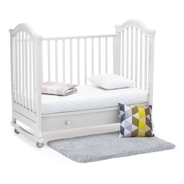 Конструкция предусматривает классический способ укачивания на дугообразных ножках. Изделие имеет прорезиненные колеса со стопорами, это позволяет не только передвигать кровать, но и фиксировать ее в неподвижном состоянии.