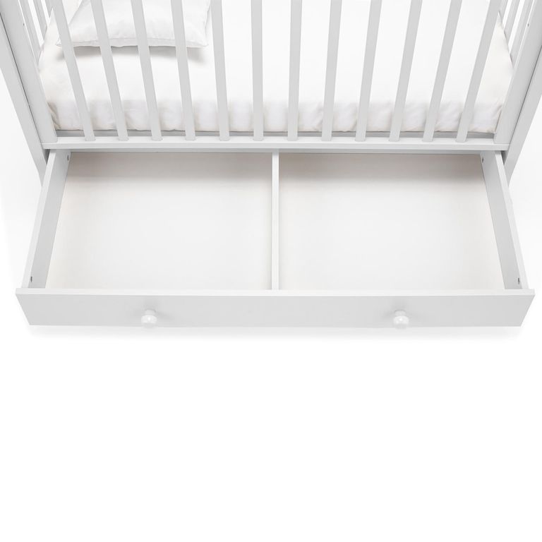Размер спального места соответствует российским стандартам и составляет 120x60см. В изделии предусмотрены 2 уровня положения ложа, в соответствии с которыми можно отрегулировать высоту боковой стенки. На поверхности поручней имеются противоскользящие накладки-«грызунки». Бельевой ящик сконструирован таким образом, что почти не привлекает внимания.