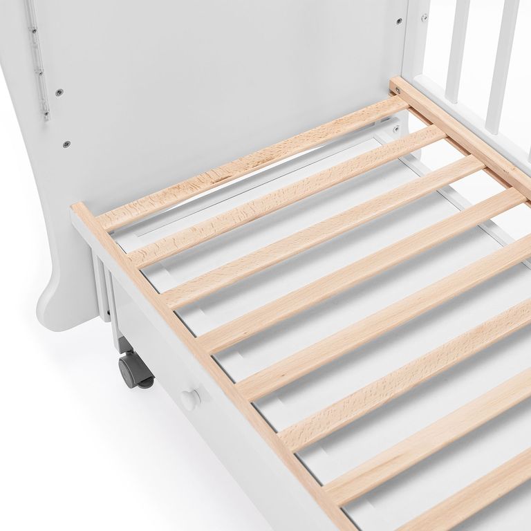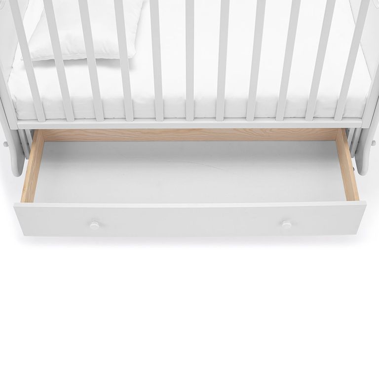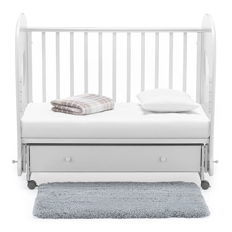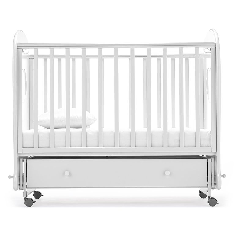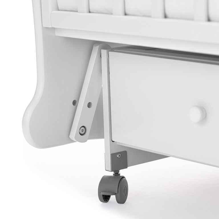 Кроватка рассчитана на малышей с рождения, максимальный вес, который способно выдержать изделие — 50 кг. Присутствует удобный механизм маятникового качания (поперечный маятник), доводчики прикроватного ящика для белья и колесики с мягким ходом (2 из них со стопорами). Реечное дно создает вентиляцию и хороший воздухообмен, а также способствует обеспечению правильной осанки у ребенка. В конструкции предусмотрено множество полезных деталей: передняя стенка является съемной, на поручнях присутствуют силиконовые накладки-«грызунки», ложе регулируется на 3-х уровнях.