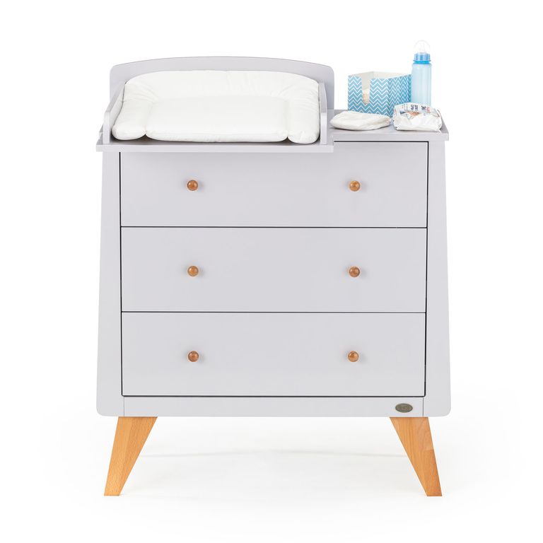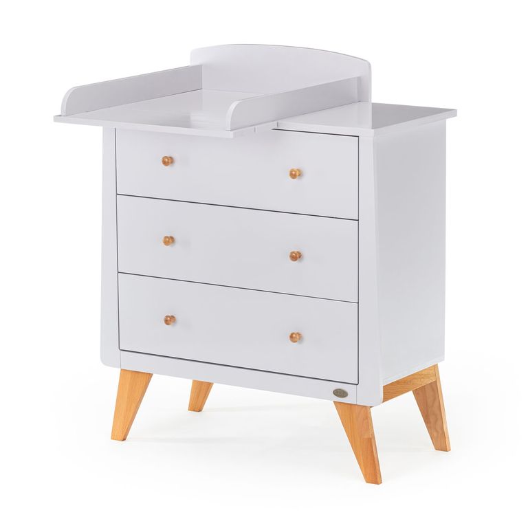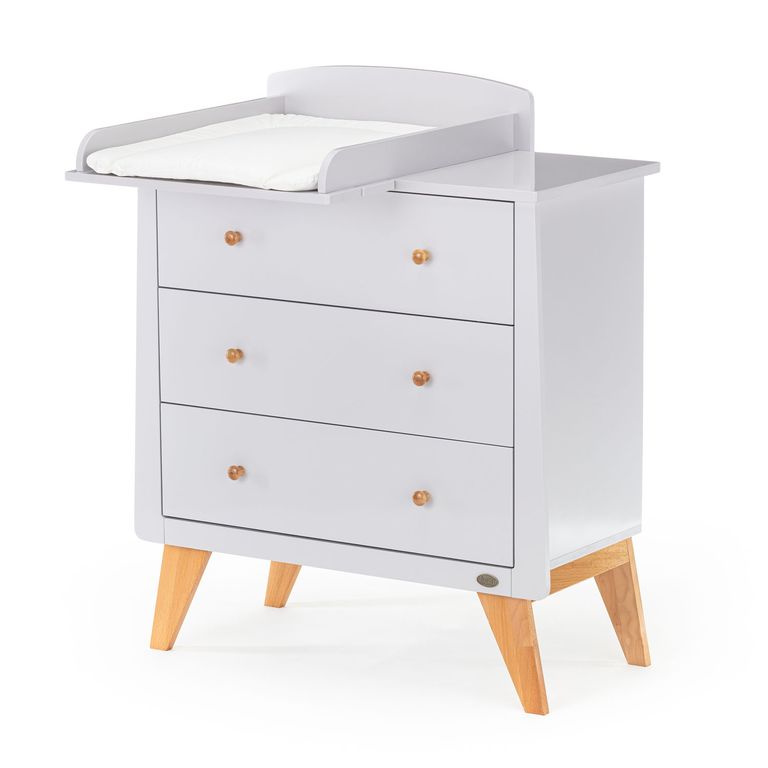 На столешнице будет удобно хранить салфетки и детскую косметику, три просторных ящика позволят разместить подгузники и белье, а плавные доводчики помогут ловко открывать и закрывать ящики даже одной рукой — ведь второй вы будете частенько держать младенца. Преимуществом данной модели также является съемная пеленальная накладка, которую можно установить как в левой, так и в правой части комода.