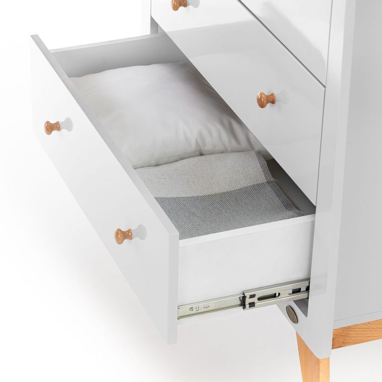 Немаловажным аспектом при обустройстве детской комнаты или детского уголка считается дизайн. С учетом этого комод выполнен в традиционном скандинавском стиле и отличается нейтральными оттенками, строгими формами и обилием натурального дерева. Современные лакокрасочные материалы, использованные в отделке, нетоксичны и долговечны, а конструкция не имеет острых углов, что не только «смягчает» ее очертания, но и бережет малыша от случайных травм.
