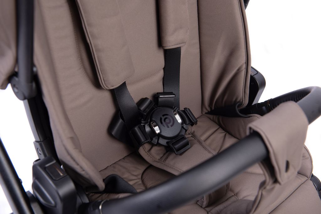 - Защиту от выпадения малыша из коляски обеспечат пятиточечные ремни безопасности с магнитным замком, и бампером.
