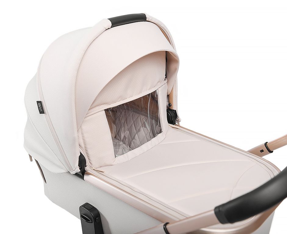 - Для лучшей циркуляции воздуха в жаркие летние дни в капоре люльки и у изголовья есть москитная сетка, спрятанная под молнией.