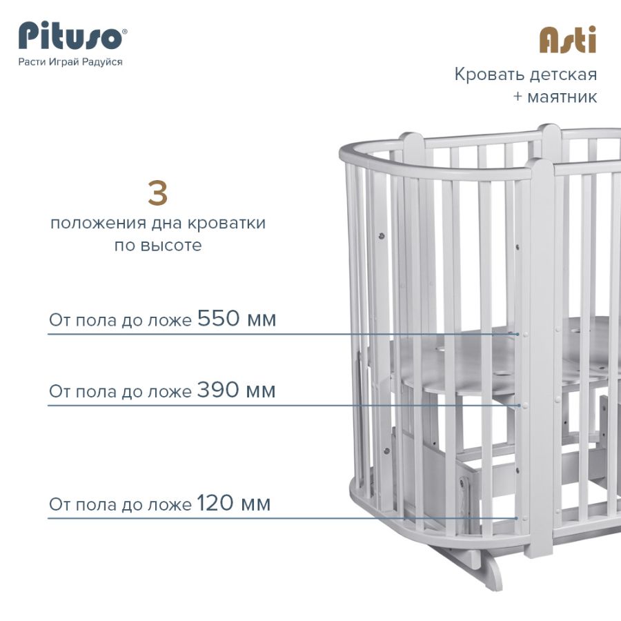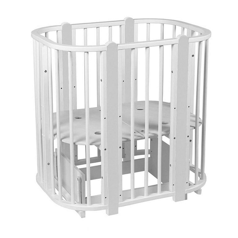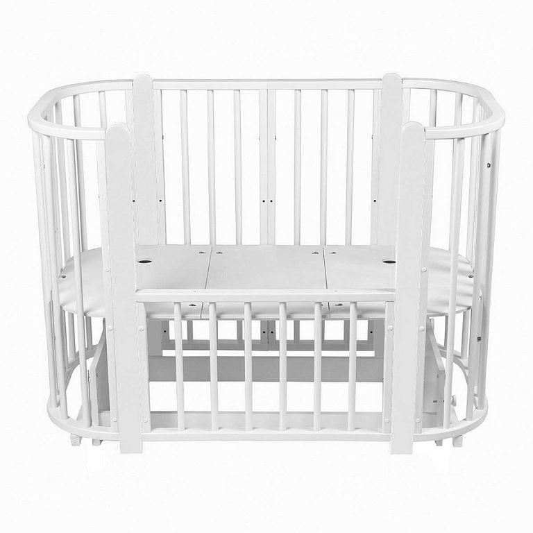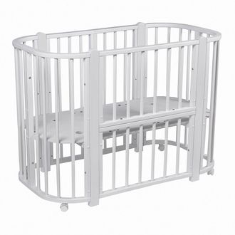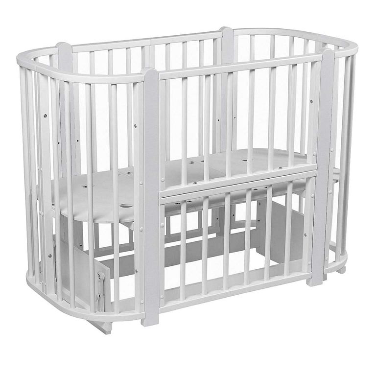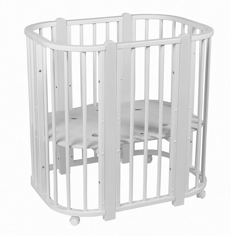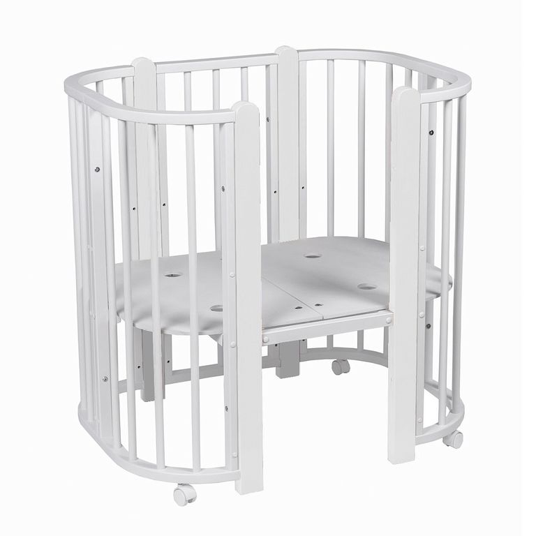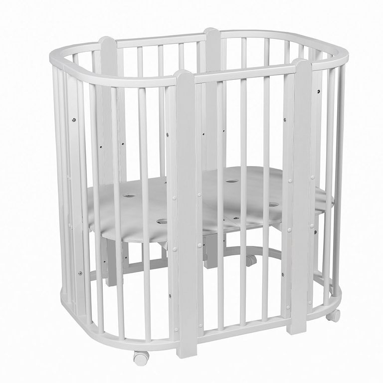 Современная кроватка необычной овальной формы для ребенка с рождения до 3 лет. Уже доказано, что ребенок в первые месяцы после рождения лучше спит в небольшом ограниченном пространстве, там более уютно и спокойно. В этот период рекомендуем использовать колыбель. В дальнейшем кроватка трансформируется в полноценную овальную кроватку с закругленными углами. У кроватки простой, но очень красивый внешний вид. Она полностью безопасна для ребенка и не имеет острых углов