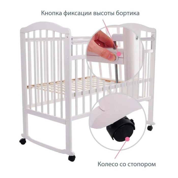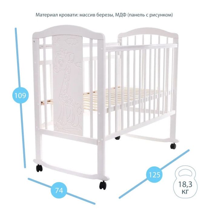 Современная и элегантная модель детской кроватки. Одна из спинок декорирована рисунком. Кроватка обладает высоким качеством и комфортом, как для ребенка, так и для родителей. Передняя стенка особенно надежна благодаря тому, что подвижна только верхняя планка.