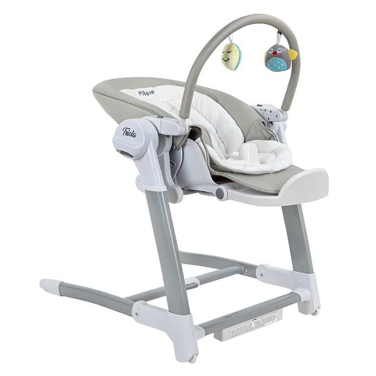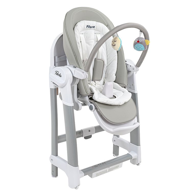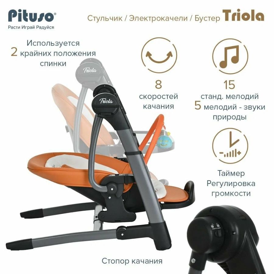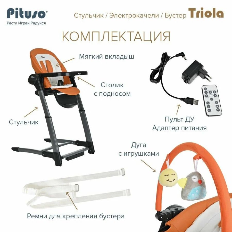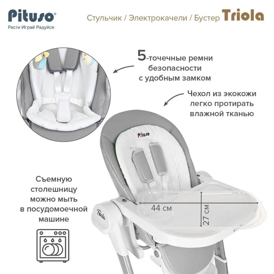 Стульчик Pituso Triola - уникальный предмет мебели для ребенка с рождения, сочетающий в себе три варианта использования: электрокачели, стульчик для кормления и бустер. Стульчик прост в эксплуатации: легко трансформируется, передвигается, быстро складывается. Чехол выполнен из качественной экокожи. Столик состоит из двух частей, верхний поднос снимается, можно мыть в посудомоечной машине.