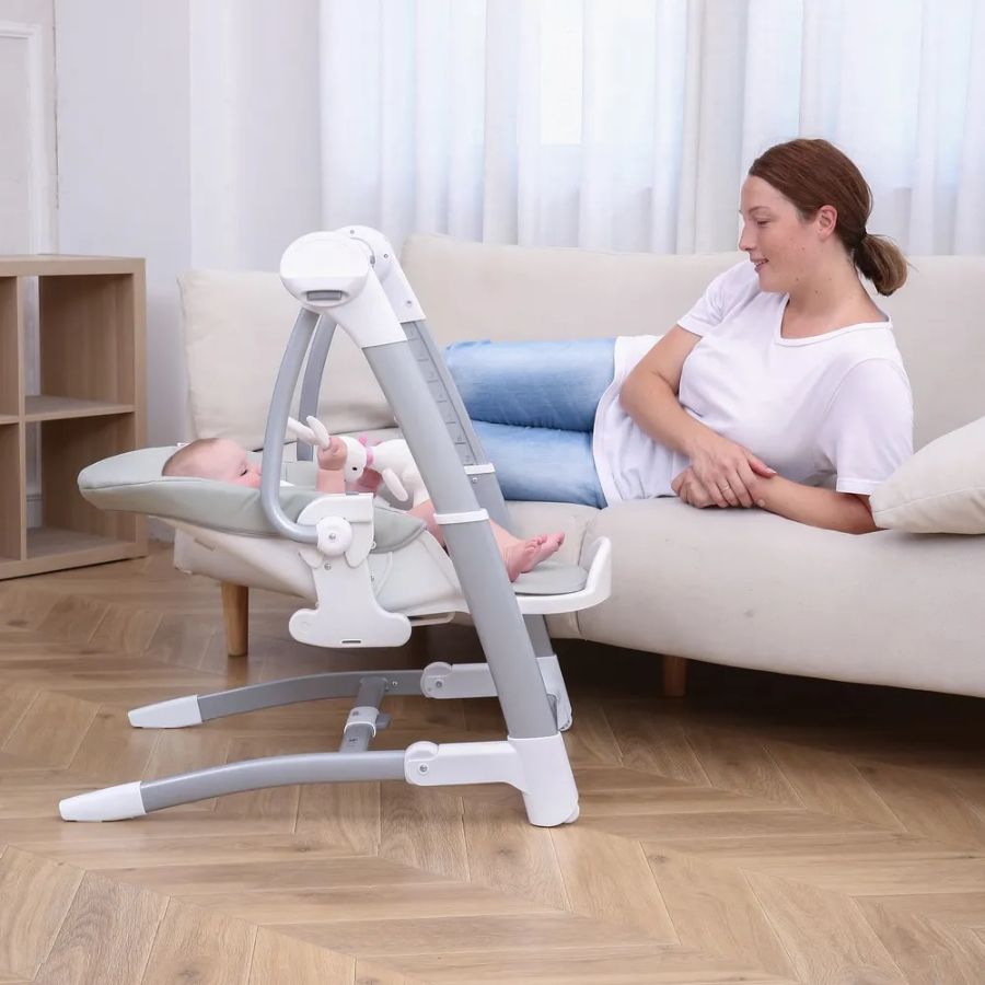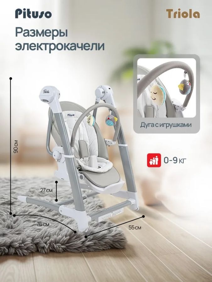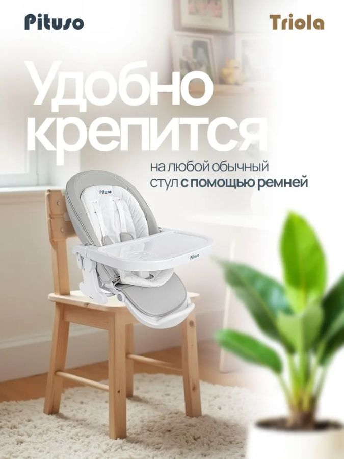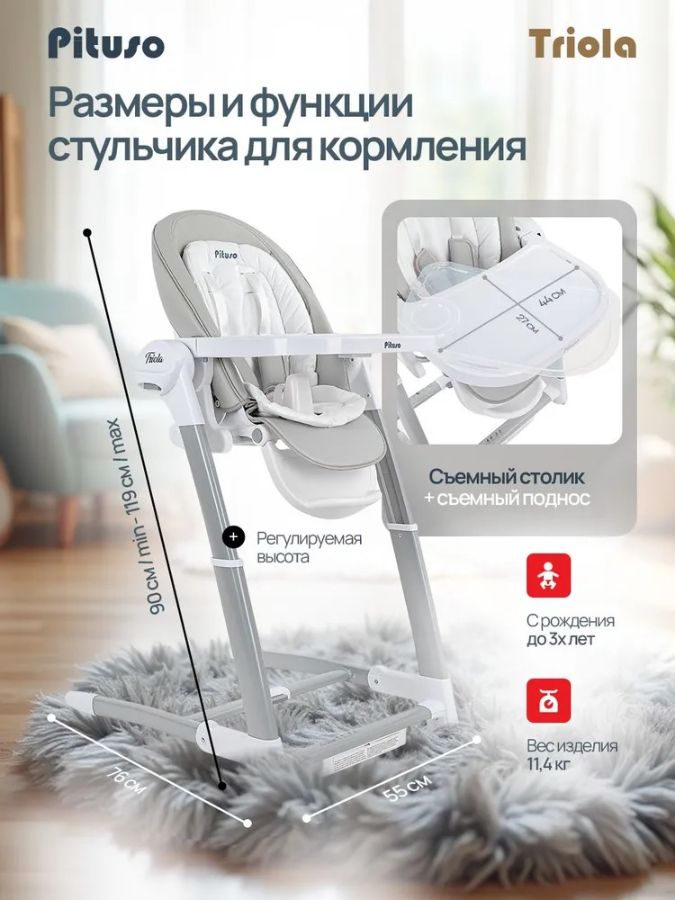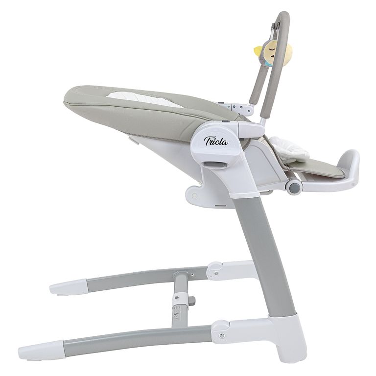 Стульчик Pituso Triola - уникальный предмет мебели для ребенка с рождения, сочетающий в себе три варианта использования: электрокачели, стульчик для кормления и бустер. Стульчик прост в эксплуатации: легко трансформируется, передвигается, быстро складывается. Чехол выполнен из качественной экокожи. Столик состоит из двух частей, верхний поднос снимается, можно мыть в посудомоечной машине.