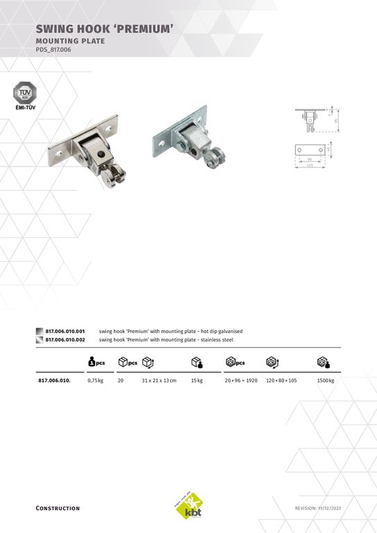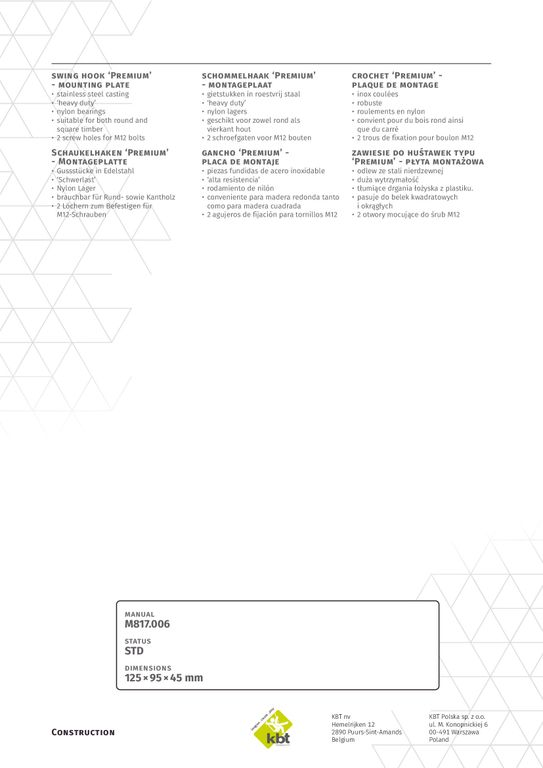 Подвес KBT для качелей Premium на плоской платформе, нерж. сталь, 817.006.010.002 габариты упаковки: 20 шт., 31х21х13 см, 15 кг.