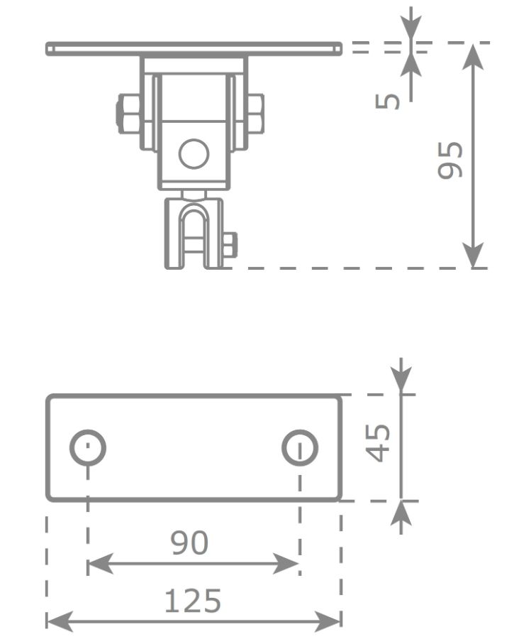 Подвес для качелей КВТ с плоской планкой разработан под квадратный брус. Размеры планки 125 x 45 мм. На планке два отверстия Ø 8,5 мм.
