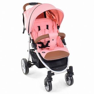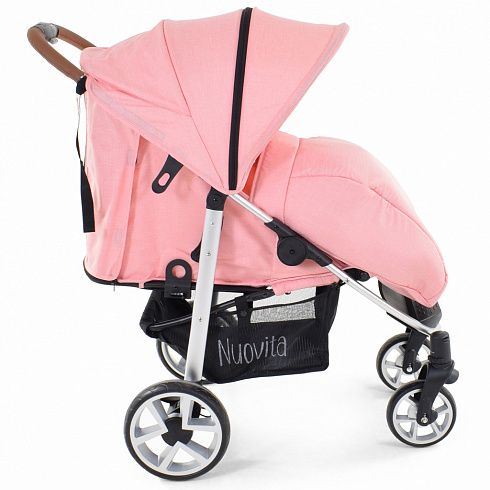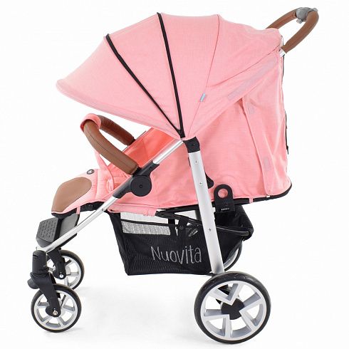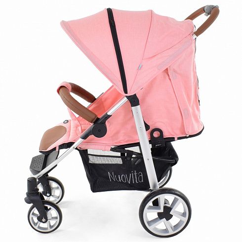 Ширина задней колесной базы составляет 57 см, передняя колесная база имеет ширину 33 см. Благодаря такой конструктивной особенности при передвижении с коляской Nuovita Corso удобно как пользоваться стандартными пандусами, так и передвигаться в торговых центрах и на многолюдных улицах. Амортизация, предусмотренная на обеих колесных базах, обеспечивает действительно мягкую езду независимо от неровностей дороги. Удобный ножной тормоз активируется тормоз нажатием ноги на педаль, расположенную над задним колесом. Коляска Nuovita Corso может служить как для прогулок, так и для отдыха малыша, имея функцию горизонтальной раскладки и комфортный размер спального места. Для безопасности малыша предусмотрены пятиточечные ремни с мягкими накладками, имеющие паховый ограничитель из ткани.
