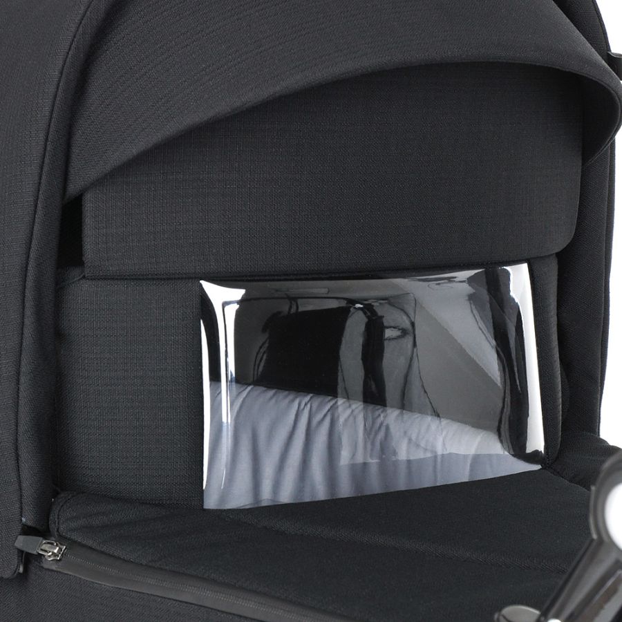 Специальный подъёмный механизм, с его помощью можно поднимать и опускать подголовник в люльке. Наружный размер люльки: 88 х 43 см. Внутренний размер по верху люльки: 84 х 38 см. Глубина люльки: 25 см. Вес люльки: 4,8 кг. Внутри расположен матрасик в хлопковом чехле, который легко снимается для стирки. Вся внутренняя обшивка выполнена из хлопка, пристёгнута молнией, можно снимать для стирки. Капор имеет жёсткое крепление к люльке, на нём находится ручка для переноски люльки, в раскрытом положении он фиксируется, для сложения необходимо нажать кнопки с двух сторон. В капор встроена антимоскитная сетка и дополнительный козырёк для защиты от солнца и дождя. Накидка на люльку имеет дополнительный отворот со смотровым окном, сам отворот полностью закрывает ребенка от непогоды и крепится за счёт магнитов. Все элементы взаимодействия люльки безшумные. Люльку можно установить в любом направлении, установка происходит в 1 движение, просто поставьте люльку на раму до щелчка. Для снятия люльки необходимо взять за 2 ручки и потянуть вверх и тогда люлька отцепится от рамы.
