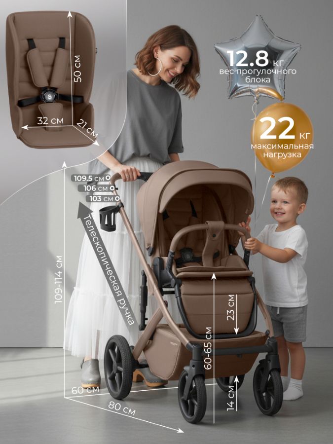 - Размер в разложенном виде с прогулочным блоком (ДхШхВ): 84х59,5х103-109,5 (по ручке), 84х59,5х109-114 (по капюшону)
