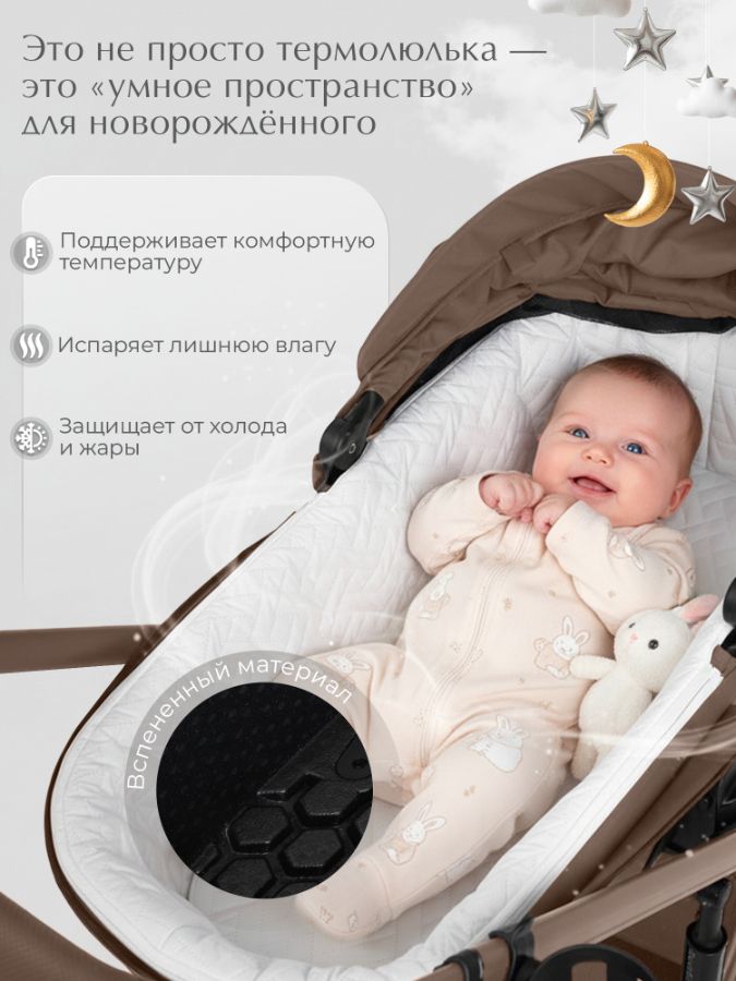 - Термолюлька нового поколения 85х43х66 см, которая обеспечивает оптимальную температуру внутри и обладает отличной теплоизоляцией - малышу комфортно в любых погодных условиях и служит барьером от внешнего мира: