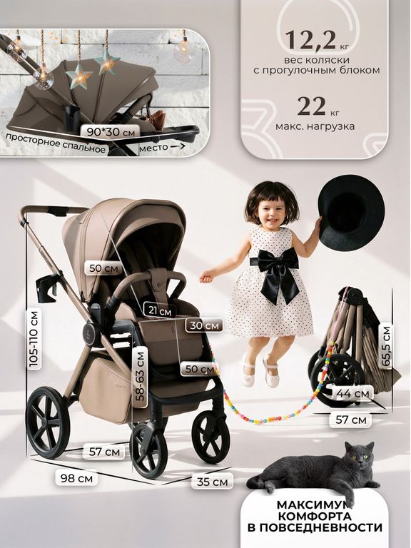 - Высота коляски с прогулочным блоком: 110-117 см (верхнее положение), 105-112 см (нижнее положение)