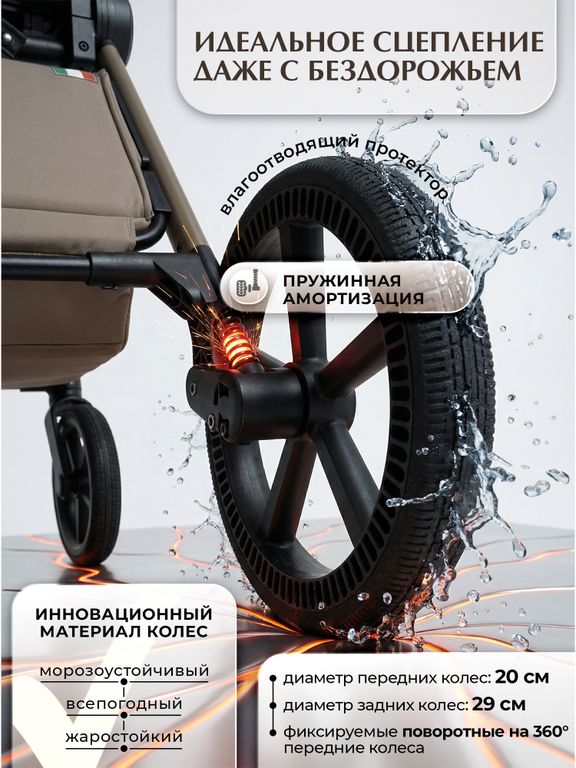 - Увеличенные колеса из высокомолекулярного полимера, аналогичных тем, что используются в беговых кроссовках. Эти колеса гарантируют отличную амортизацию и сцепление с различными покрытиями, что делает каждую прогулку плавной и комфортной. Колеса с водоотводящими протекторами обеспечивают надежное сцепление и уверенную проходимость по улицам, защищая от проскальзывания и предоставляя дополнительную безопасность.
