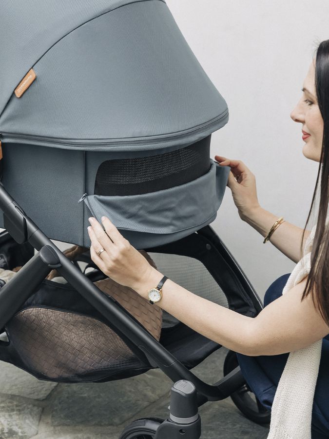 Капор прогулочного сиденья, оснащенный дополнительной секцией на молнии, обеспечивает защиту от солнца, ультрафиолетовых лучей с защитой UPF 50+ и ветра, а смотровые окошки с москитными сетками позволяют наблюдать за ребенком во время прогулки и создают в коляске комфортный микроклимат.