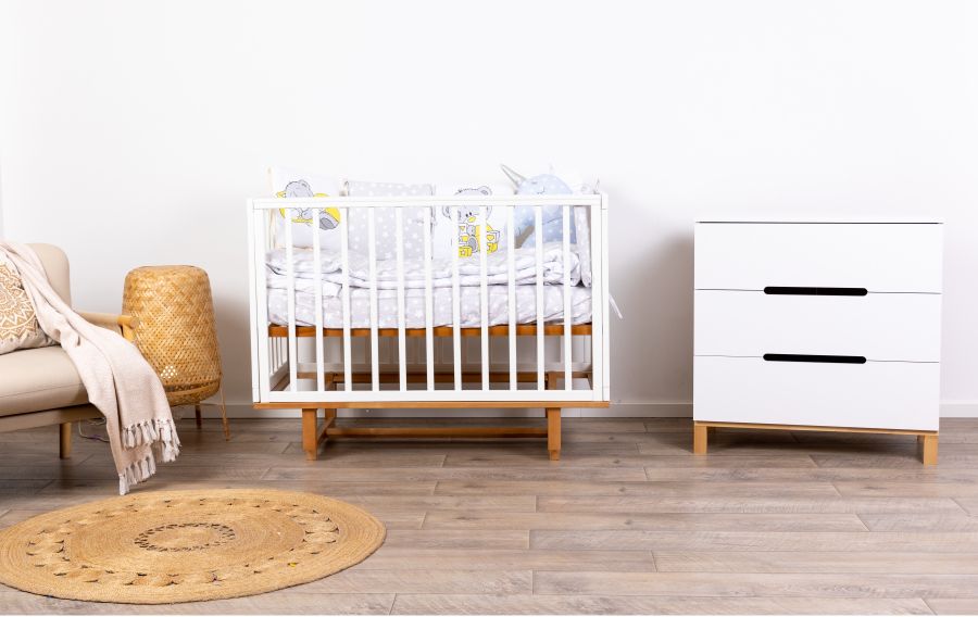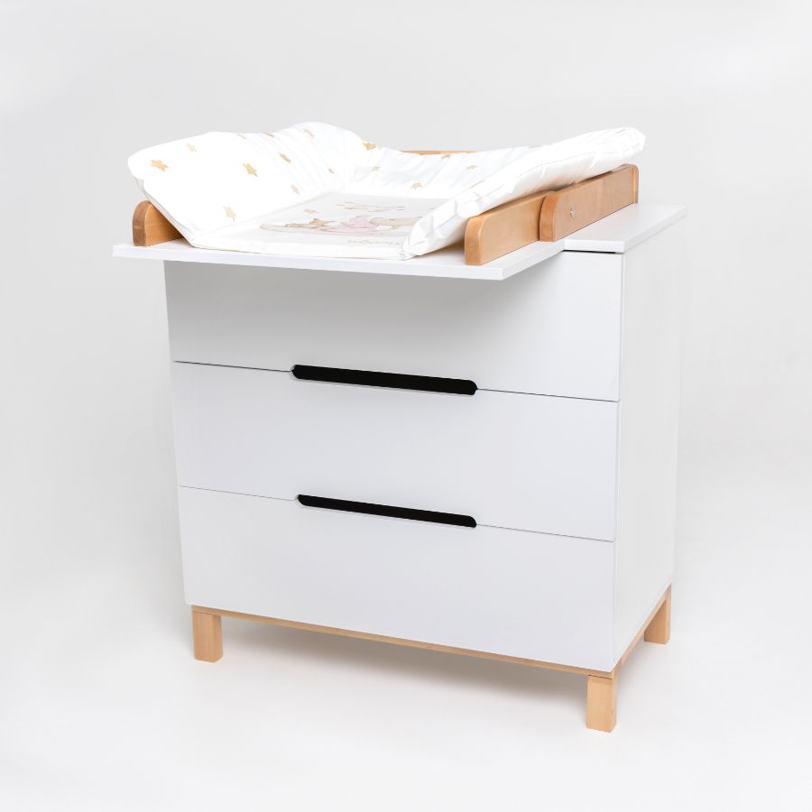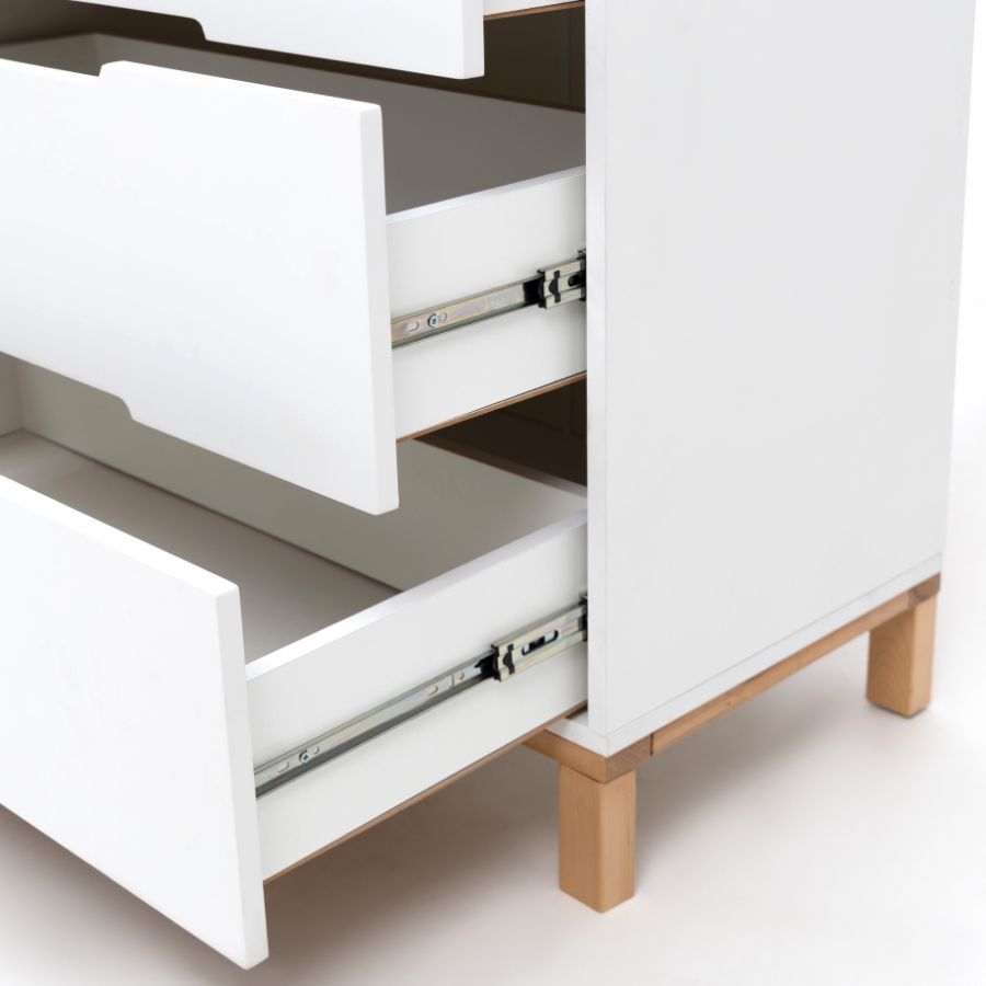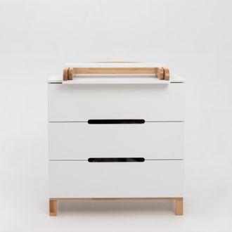 Глубокие ящики вместят в себе необходимое для малыша: средства для ухода, пелёнки, одежду и постельное белье. Плавный и тихий ход выдвижных ящиков не потревожит сон малыша, а ножки из натурального дерева придают комоду большую устойчивость.
